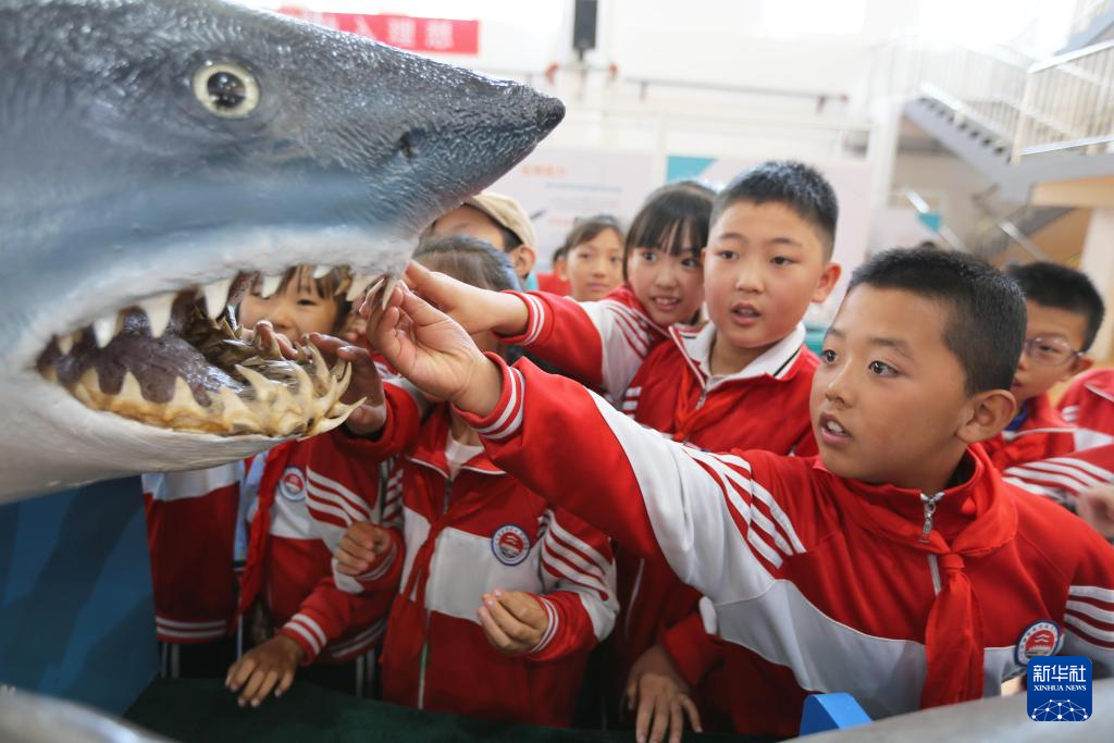 9月8日,在甘肃省定西市举办的“山海相依,筑梦蔚蓝”山东青岛·甘肃定西海洋科普东西部协作主题活动中,定西市安定区关川实验学校的学生在观看海洋生物标本。新华社发(王克贤摄)