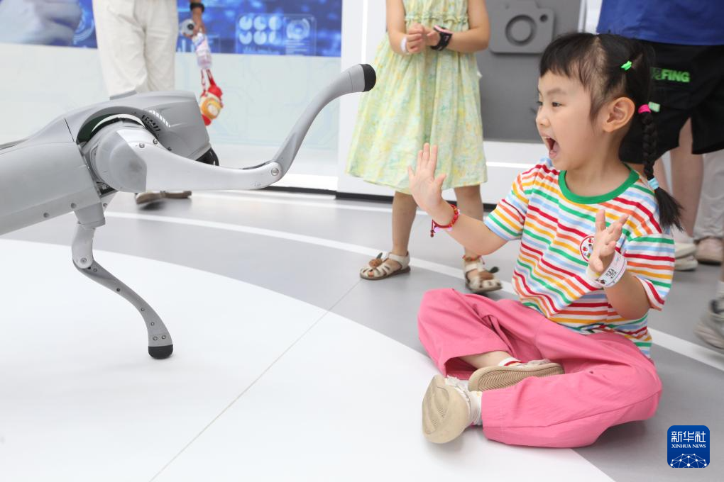 9月7日,在位于江苏省徐州市云龙区的一家科学探索馆,小朋友与机器狗互动。新华社发(蒯创摄)