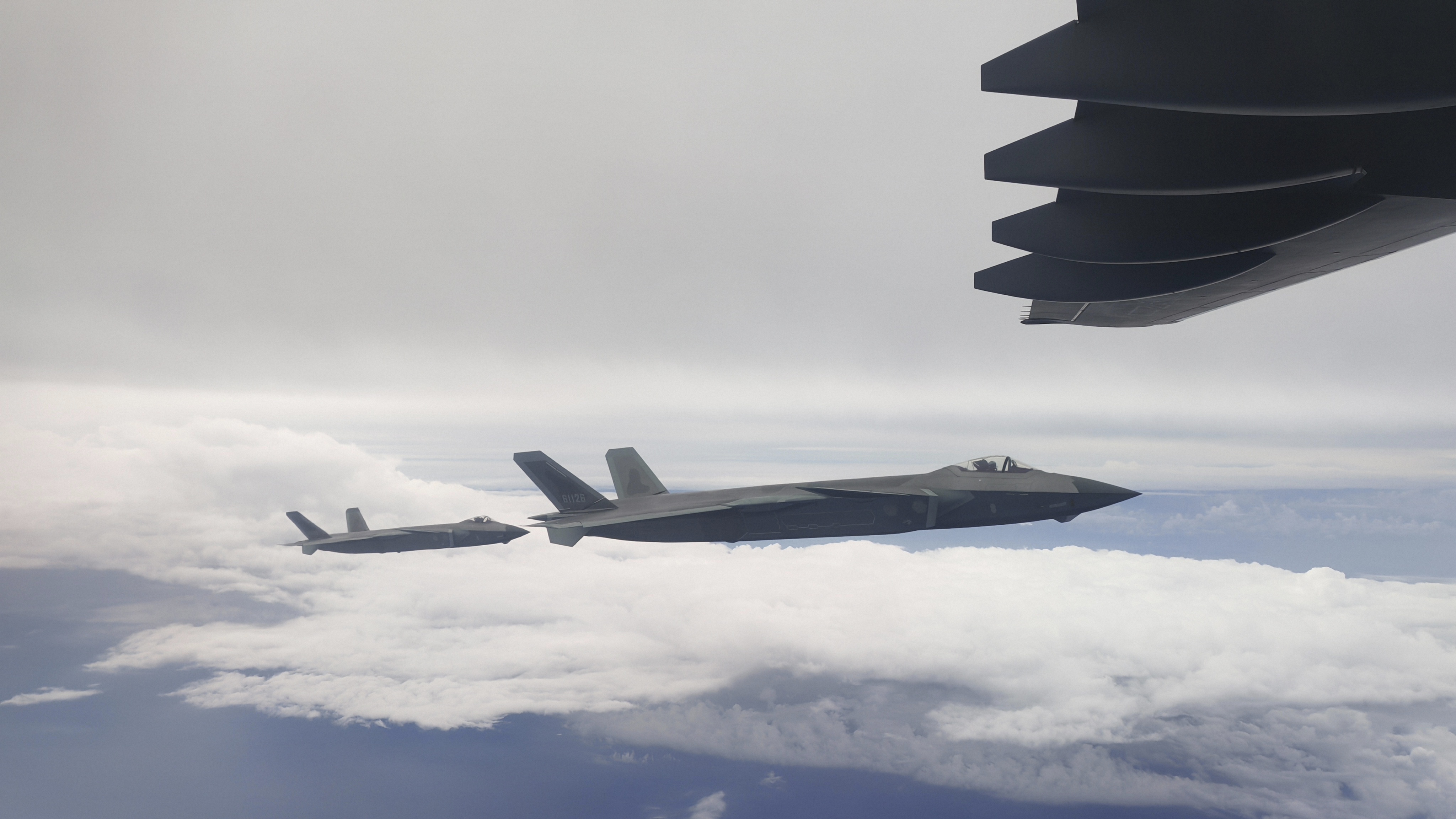 9月12日,第十二批在韩中国人民志愿军烈士遗骸回国。这是为接运烈士遗骸回国的运-20专机伴飞护航的歼-20飞机。新华社发(肖航 摄)