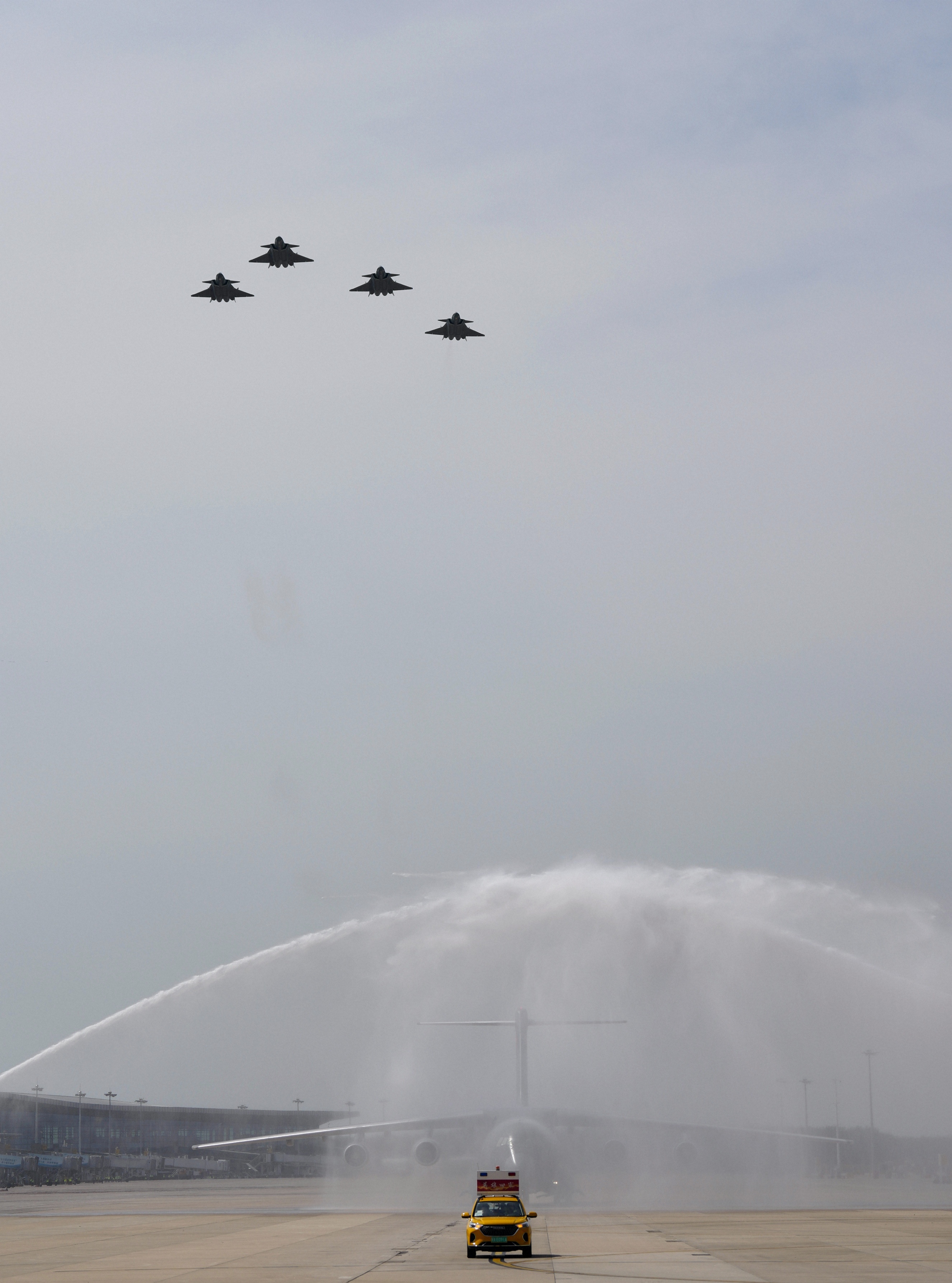 9月12日,第十二批在韩中国人民志愿军烈士遗骸回国。这是在沈阳桃仙国际机场,接运烈士遗骸回国的运-20专机通过水门。新华社发(杨盼 摄)