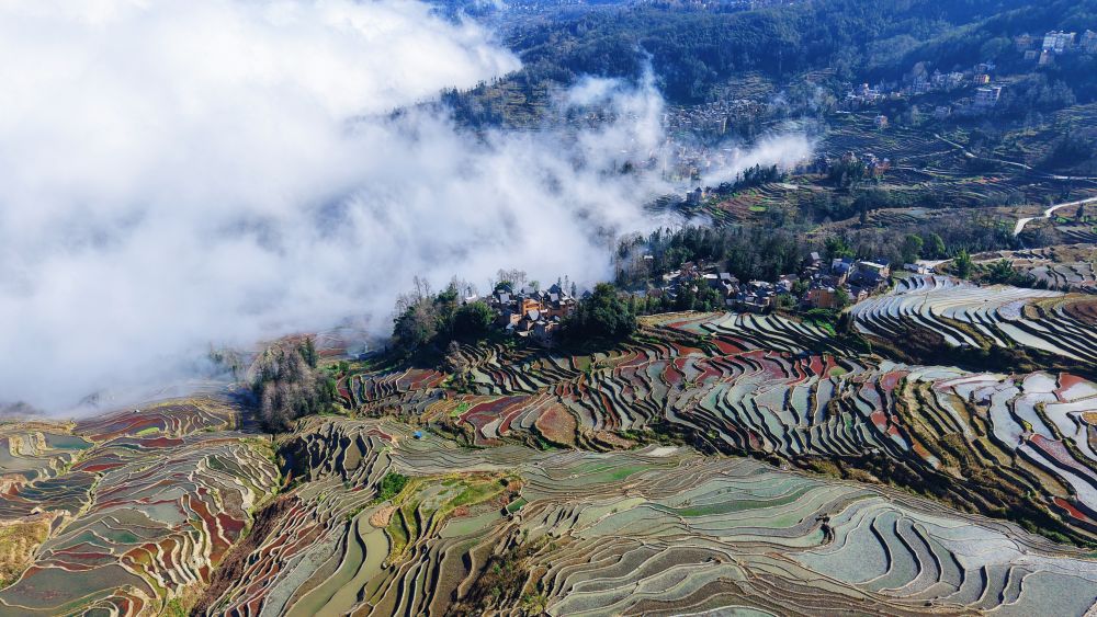 ?在云南红河州元阳哈尼梯田,层层梯田宛如明镜,当地人遵循“冬春注水养田”传统,通过层级沟渠为梯田蓄满山泉水。