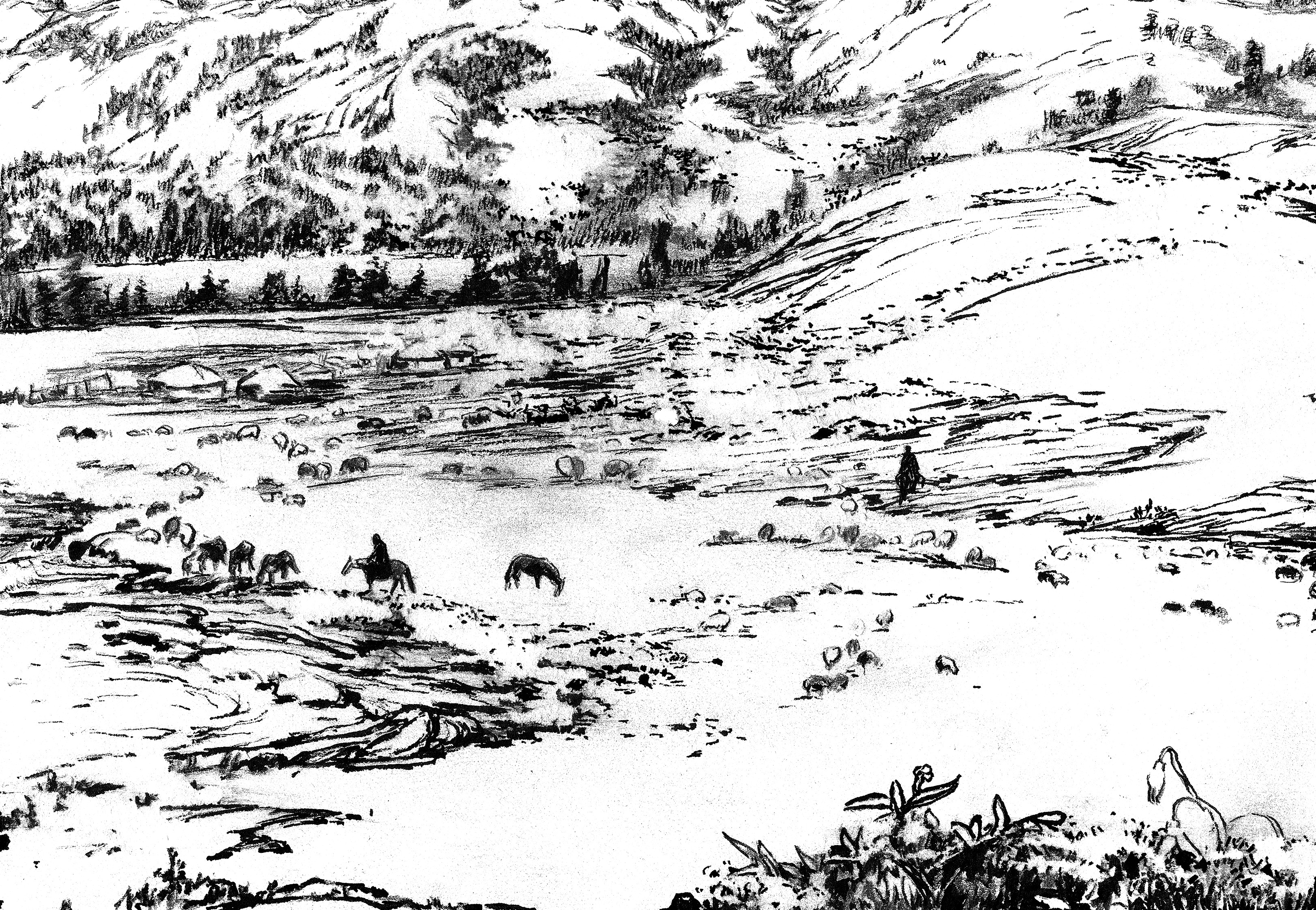 2 从小东沟向北深入20余公里,抵达乌齐里克,再向东直达五指泉。这两条大峡谷连接着拉斯特和汗德尕特。那幅最负盛名的人类滑雪起源的岩棚画,就坐落于汗德尕特以东的敦德布拉克。