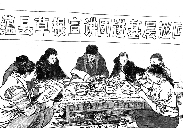 47 到了冬天,冬牧场常常大雪封山,交通不便、通信不畅。马丁别克带领宣讲团克服重重困难,把党的政策送到牧区。不通车的地方,他们就骑马甚至步行前往。