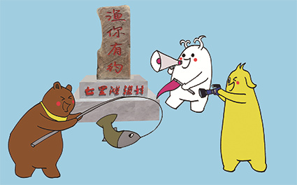 57 布布、津津和小津灵等待着更多人来到童话边城,带大家去了解更多的美景和故事。
