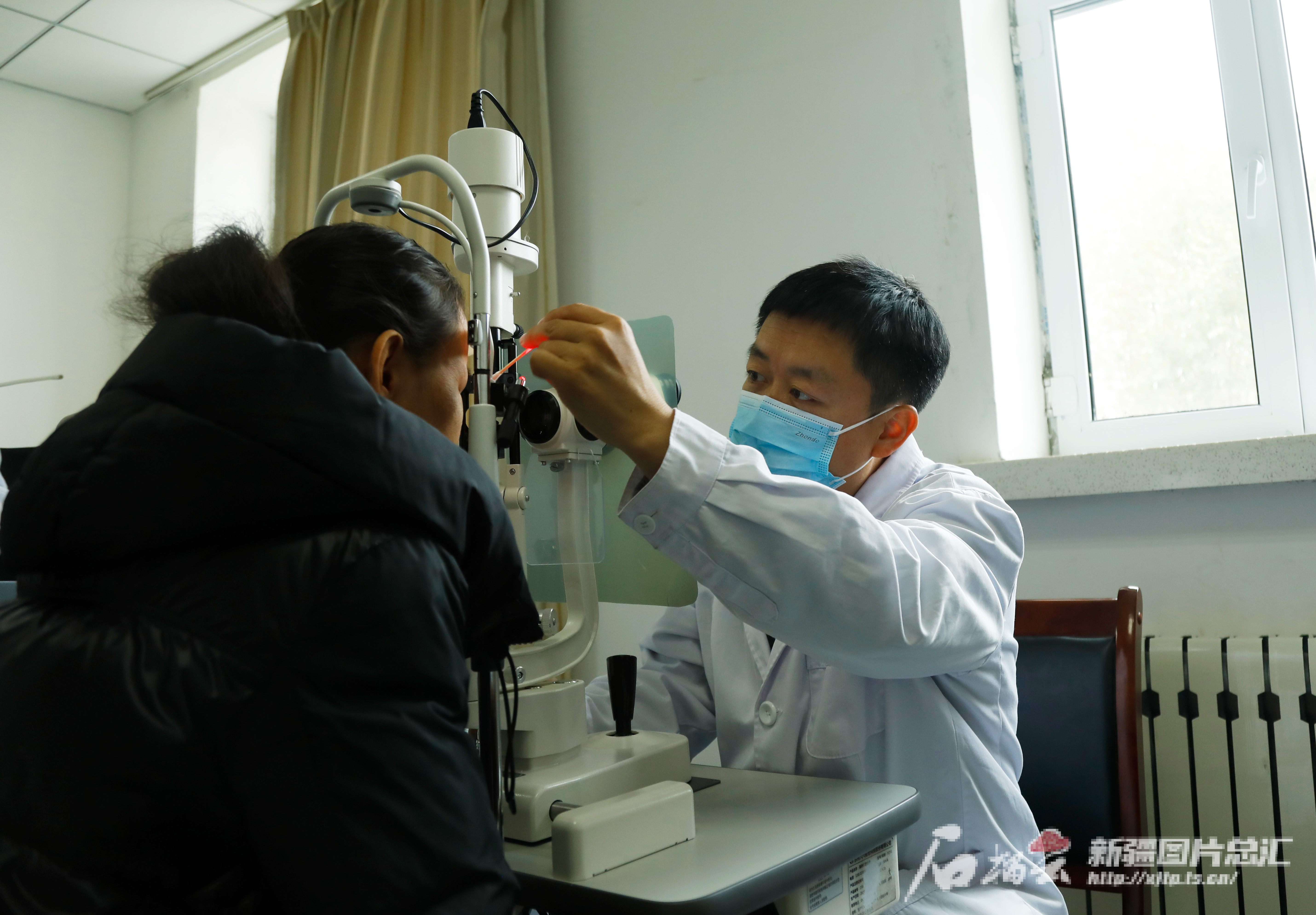 在吉木乃县人民医院,援疆医疗专家,山东大学齐鲁医院眼科副主任医师、山东大学临床副教授王家伟为患者检查眼睛。