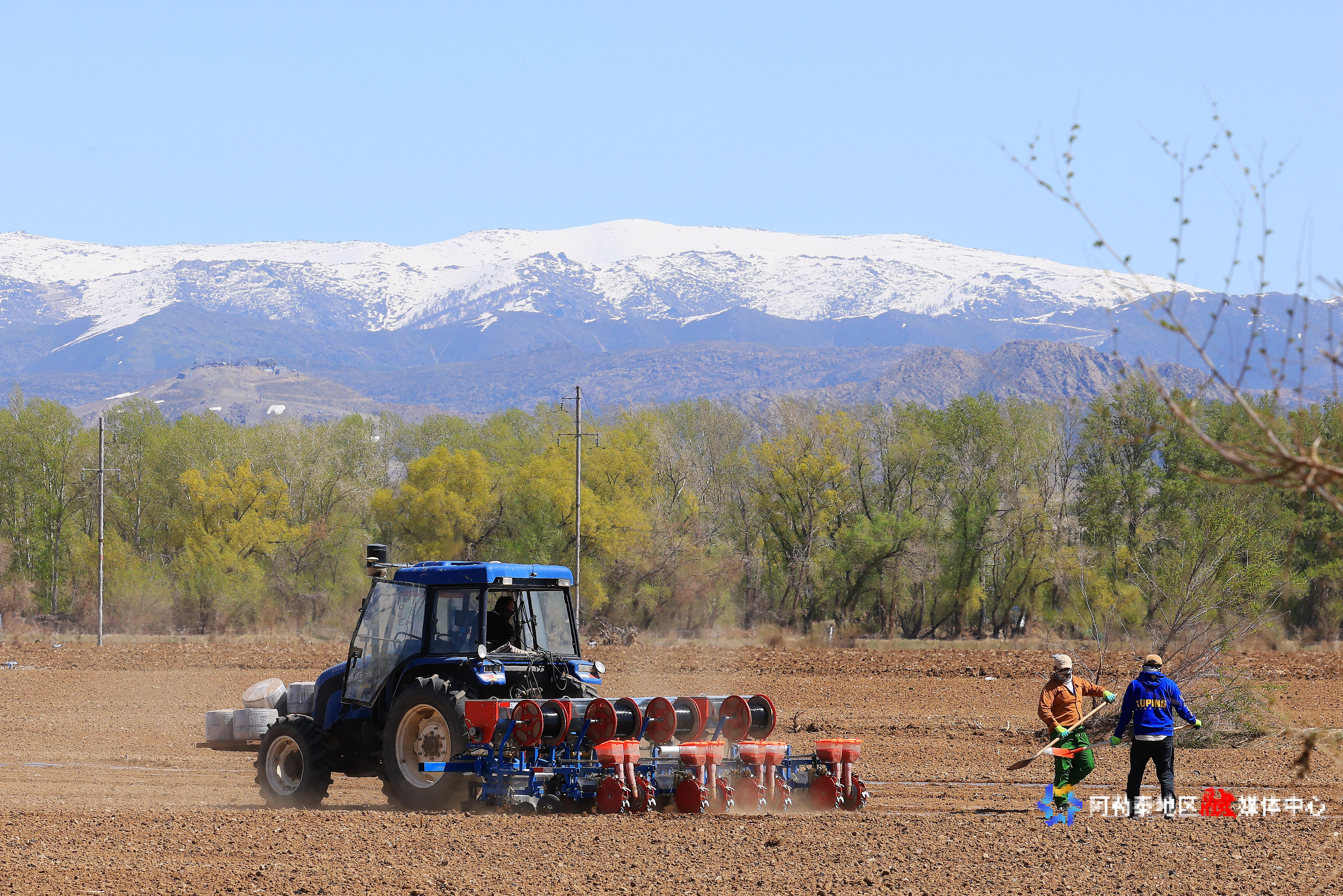 2025年4月27日,在阿勒泰市阿苇滩镇萨斯克巴斯陶村村民驾驶播种机播种玉米。记者 阿尔达克·拜斯汗 摄