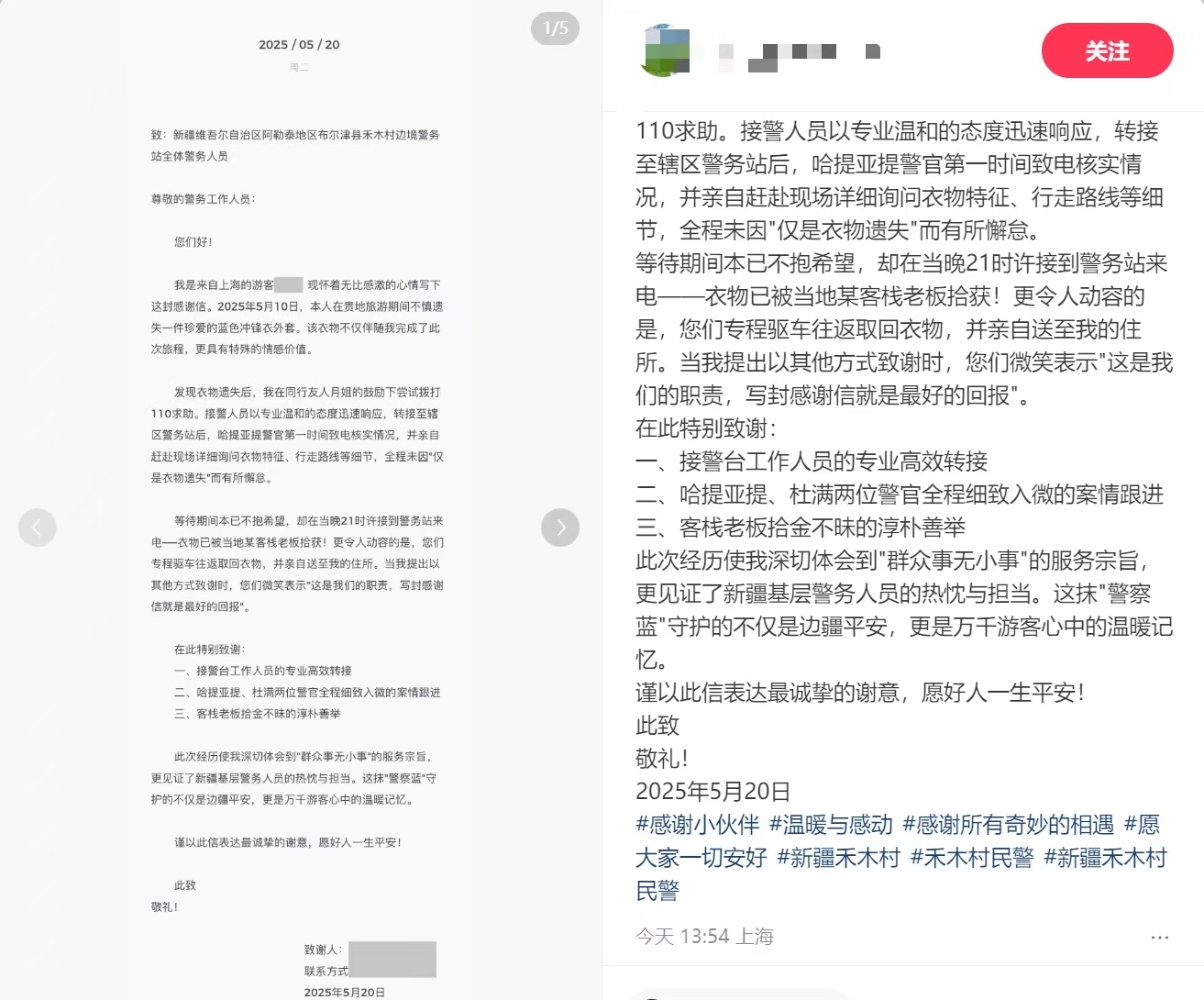 阿勒泰新闻网-阿勒泰地区融媒体中心(实习记者 王景鸿)“没想到一件小事,民警却如此放在心上!”近日,禾木边境派出所民警高效帮助游客找回遗失衣物的暖心故事,通过一封发布在小红书的感谢信引发关注。信中,游客用真挚笔触记录了民警帮其找回遗失物品的详细过程。