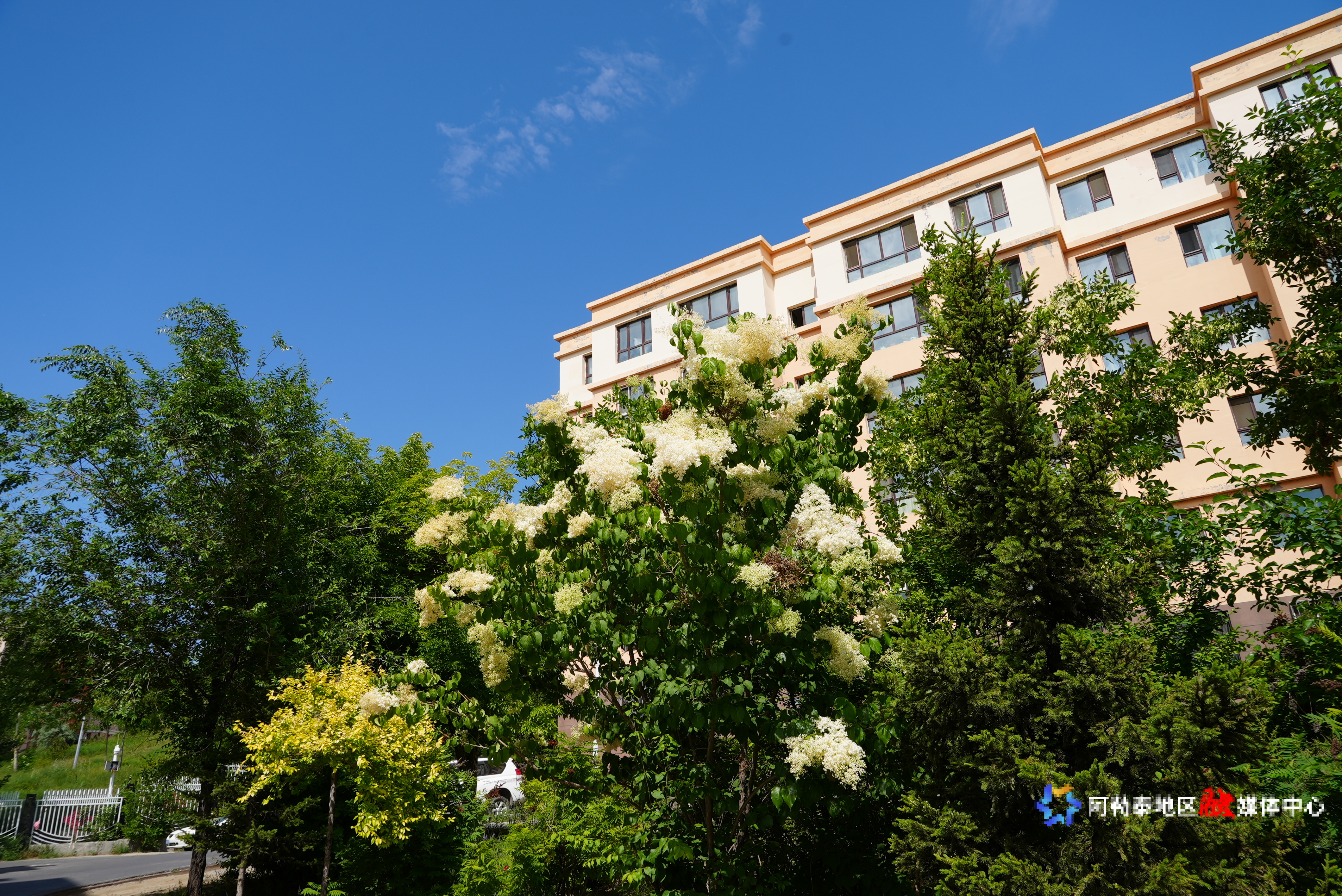 阿勒泰新闻网-阿勒泰地区融媒体中心(记者 代维利)6月18日,记者在阿勒泰市一居民小区内看到,一株暴马丁香花序如霞似锦,芬芳浓郁袭人,成为夏日独特景观。