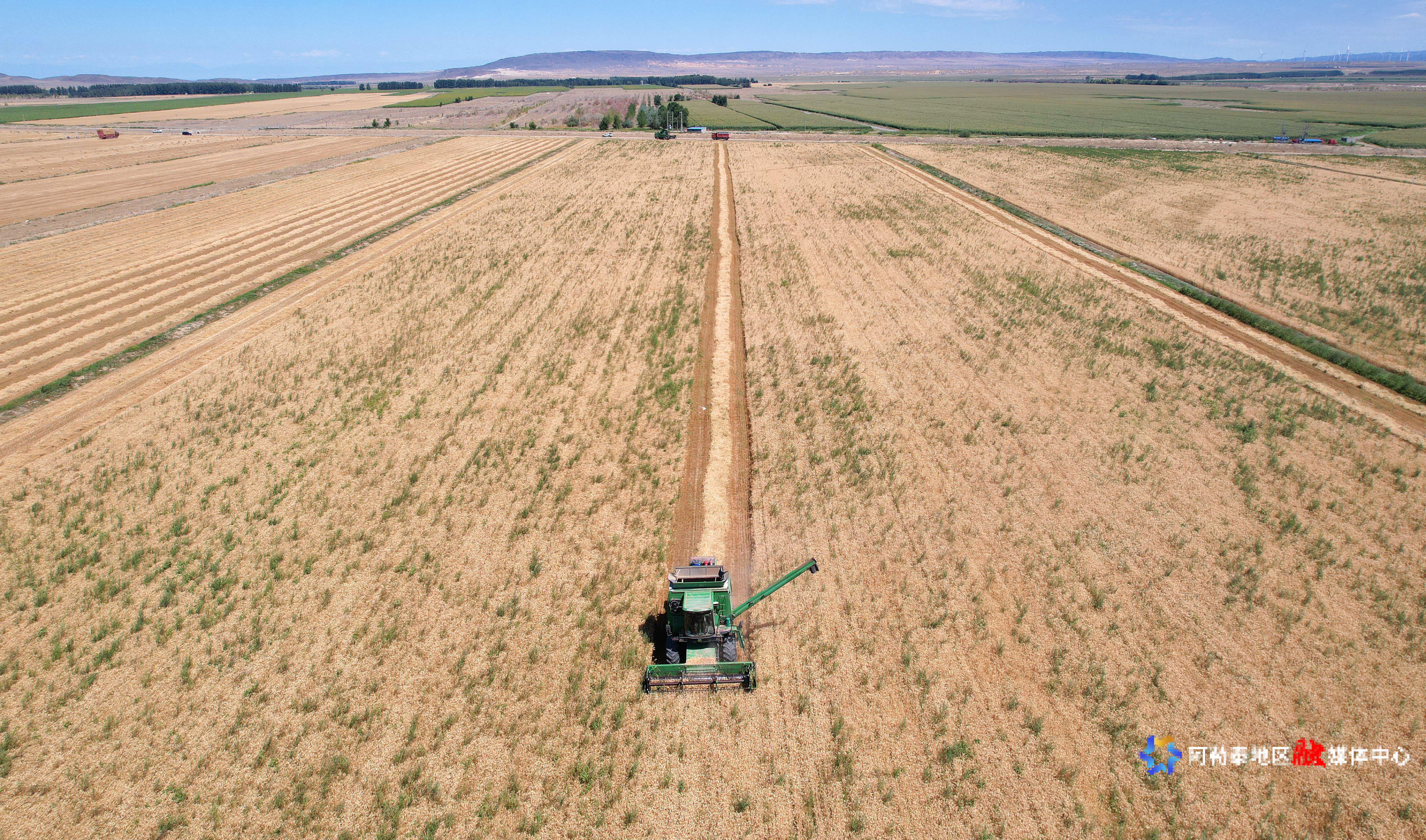2025年8月5日,吉木乃县恰勒什海乡农户驾驶农机收割小麦(无人机拍摄)。记者 阿尔达克·拜斯汗 摄