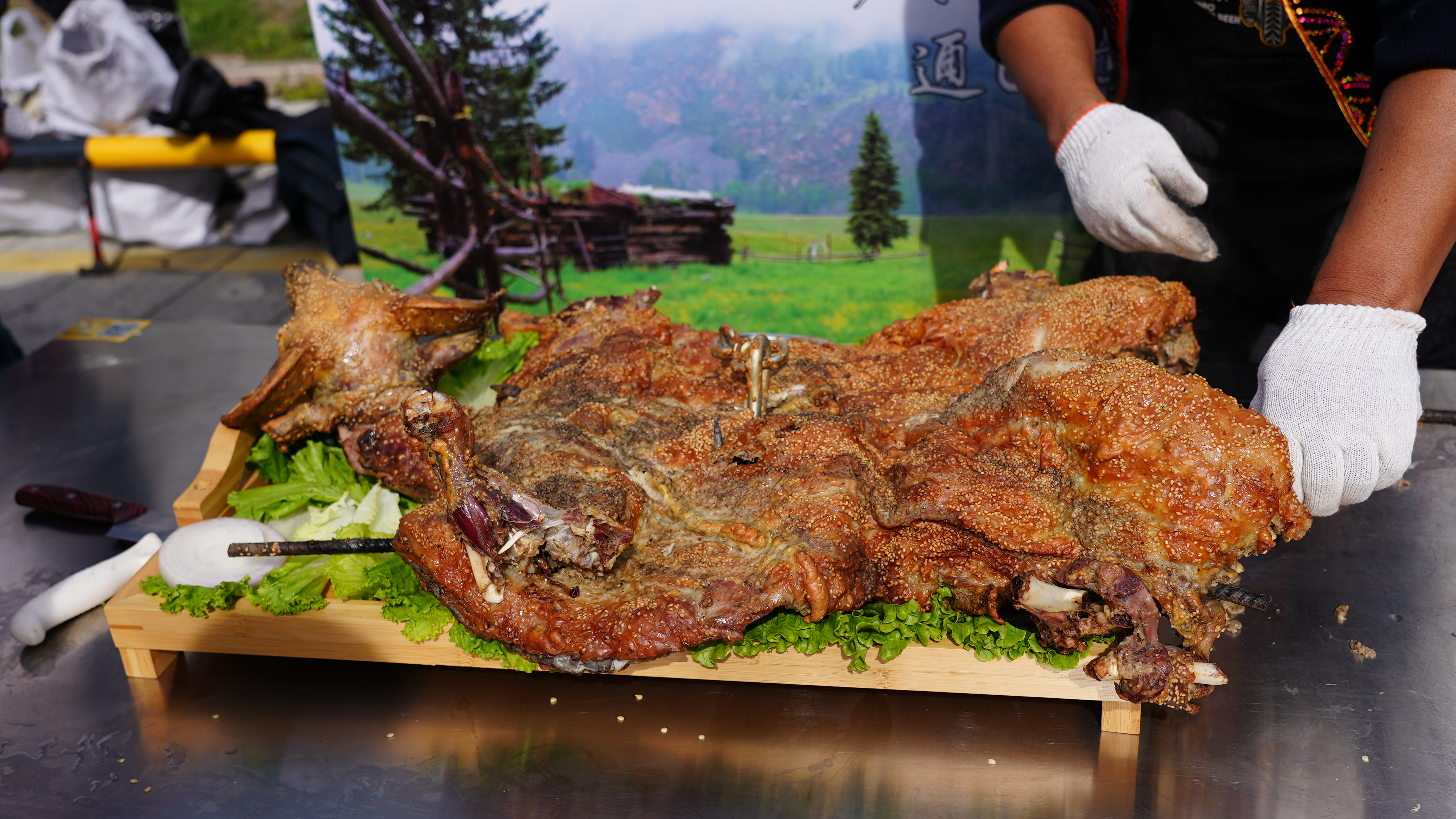 “装饰”环节是阿勒泰人热爱生活的生动写照。翠绿的香菜塞进羊嘴,宛如羊儿衔着山野的生机;羊头戴上喜庆的大红花,洋葱圈码在羊身两侧,象征“团圆圆满”;辣椒圈点缀其间,寓意生活“红红火火”;白菜片在羊腹铺成扇形,表达“百财兴旺”的吉祥愿景。