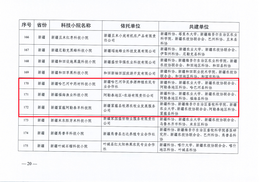 阿勒泰新闻网-阿勒泰地区融媒体中心(记者 杨玮璇)近日,中国农村专业技术协会发布《关于同意设立“中国农村专业技术协会科技小院”的批复》(农技协发字〔2025〕12号),同意设立195家中国农村专业技术协会科技小院。由阿勒泰地区科协组织申报的新疆哈巴河中药材科技小院、新疆福海渔业科技小院、新疆富蕴阿勒泰羊科技小院成功入选。