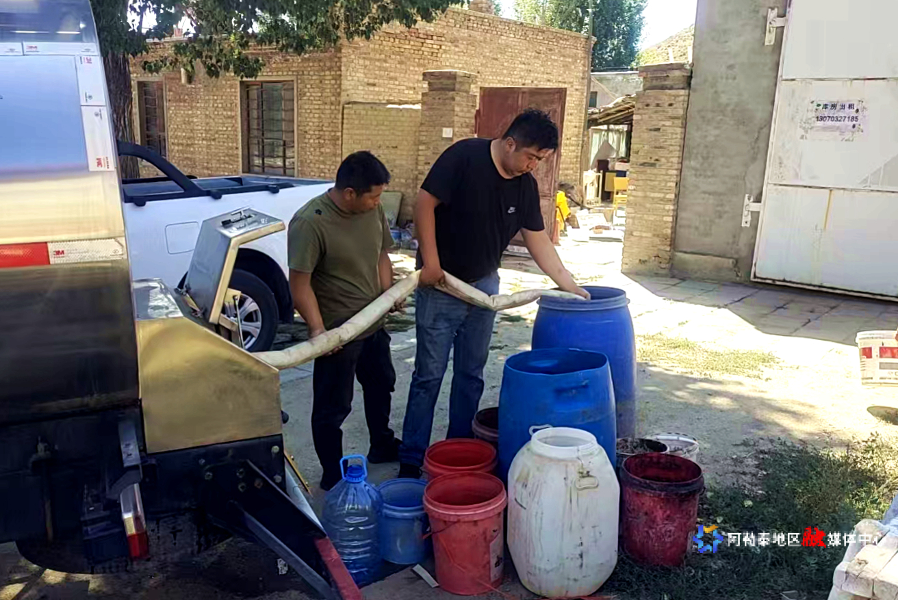 8月11日,阿勒泰市恰秀路街道恰秀社区协调送水车为阿勒泰市交通路阿福小区居民送水。(资料图)