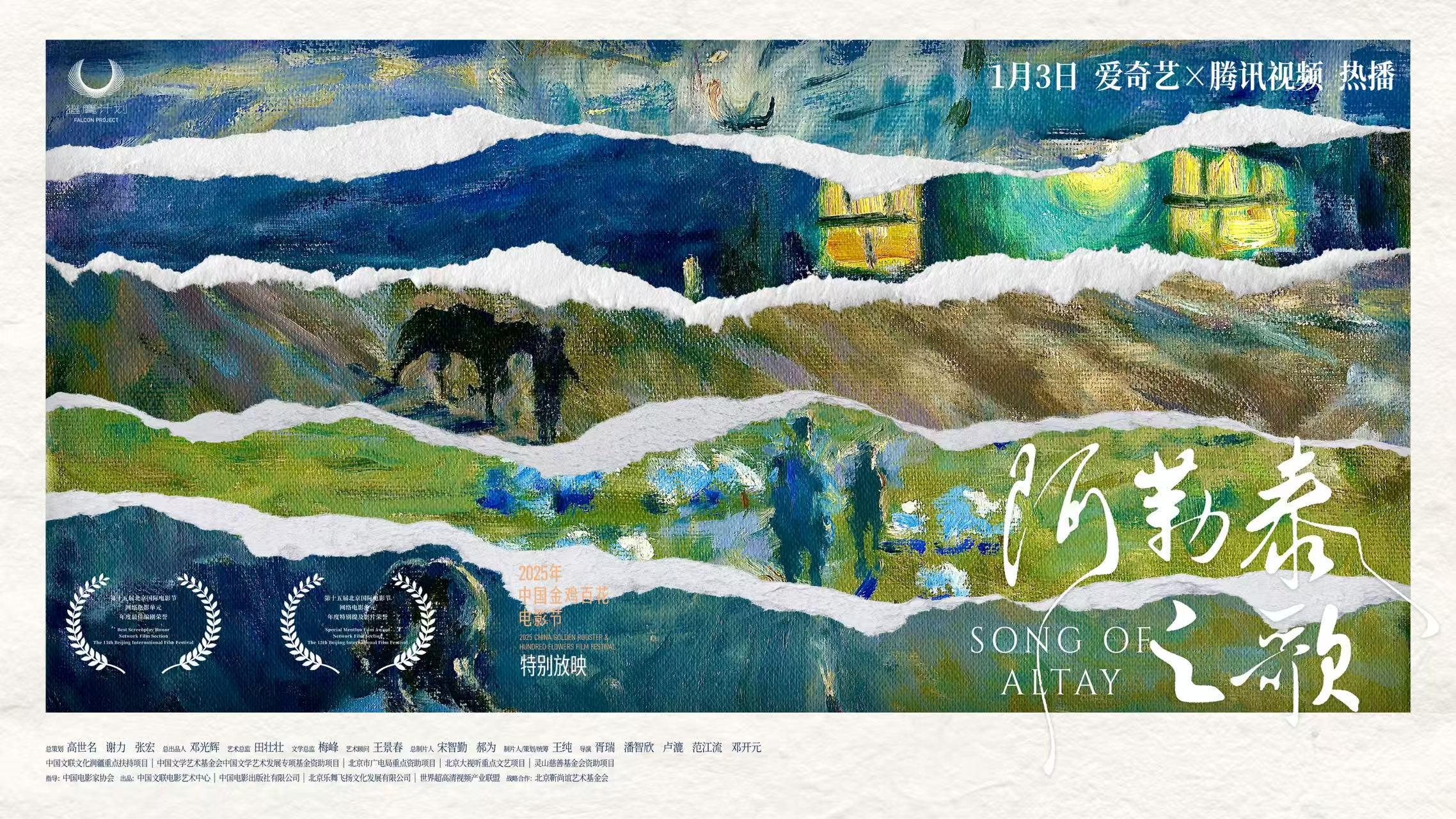电影是艺术与技术的双轮驱动。在《阿勒泰之歌》的创作过程中,项目组积极推动自主知识产权超高清视听技术的创作实践,与世界超高清视频产业联盟(UWA)展开深度合作。本片采用超高清国家标准——菁彩影像HDRVivid与菁彩声AudioVivid进行超高清版本的全流程制作,其双Vivid菁彩超高清版本,为观众呈现具有卓越动态范围、丰富色彩与沉浸音效的优质视听体验。同时,影片基于此标准首次制作了LED影院放映的超高清版本,实现了从内容创作到新型放映场景的完整技术实践;在跨艺术合作方面,项目与北京靳尚谊艺术基金会联手,组织青年画家富察丹青创作完成了五幅主题油画作品,并在此基础上巧妙拼接最终完成影片主海报设计;邀请青年演员、歌手易烊千玺献唱同名主题曲,上线当日即登顶多个榜单榜首。由此,不同领域的优秀青年创作者携手为推动“文化润疆”落地见效,绘就了一幅饱含深情又充满了人文气息与时代光芒的边疆画卷。