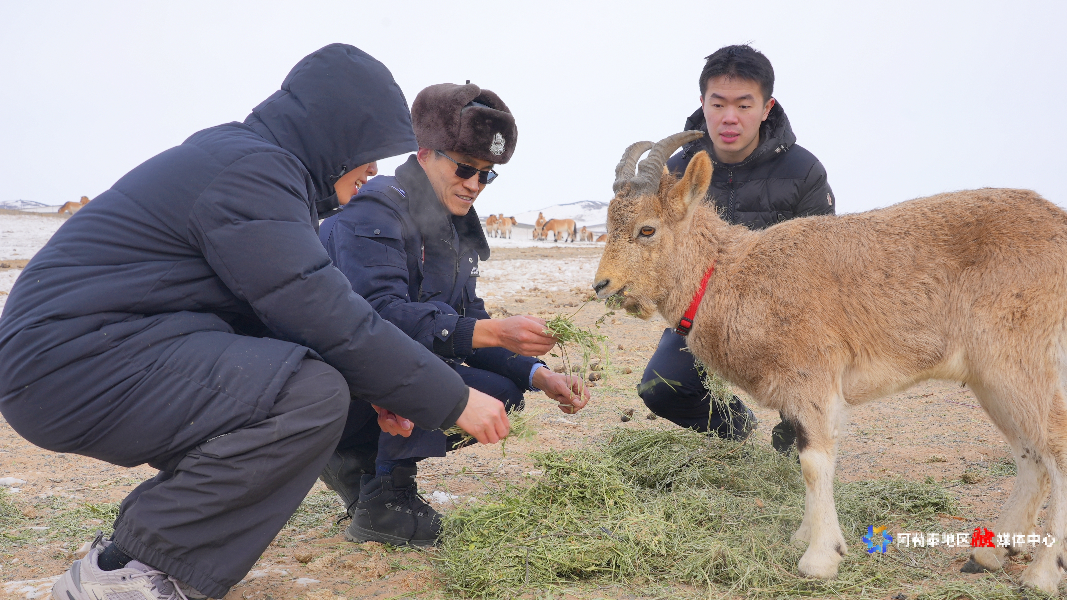 富蕴县民辅警在卡拉麦里投喂北山羊,警民守护下,这里的“精灵”与人类早已成为彼此信赖的伙伴。