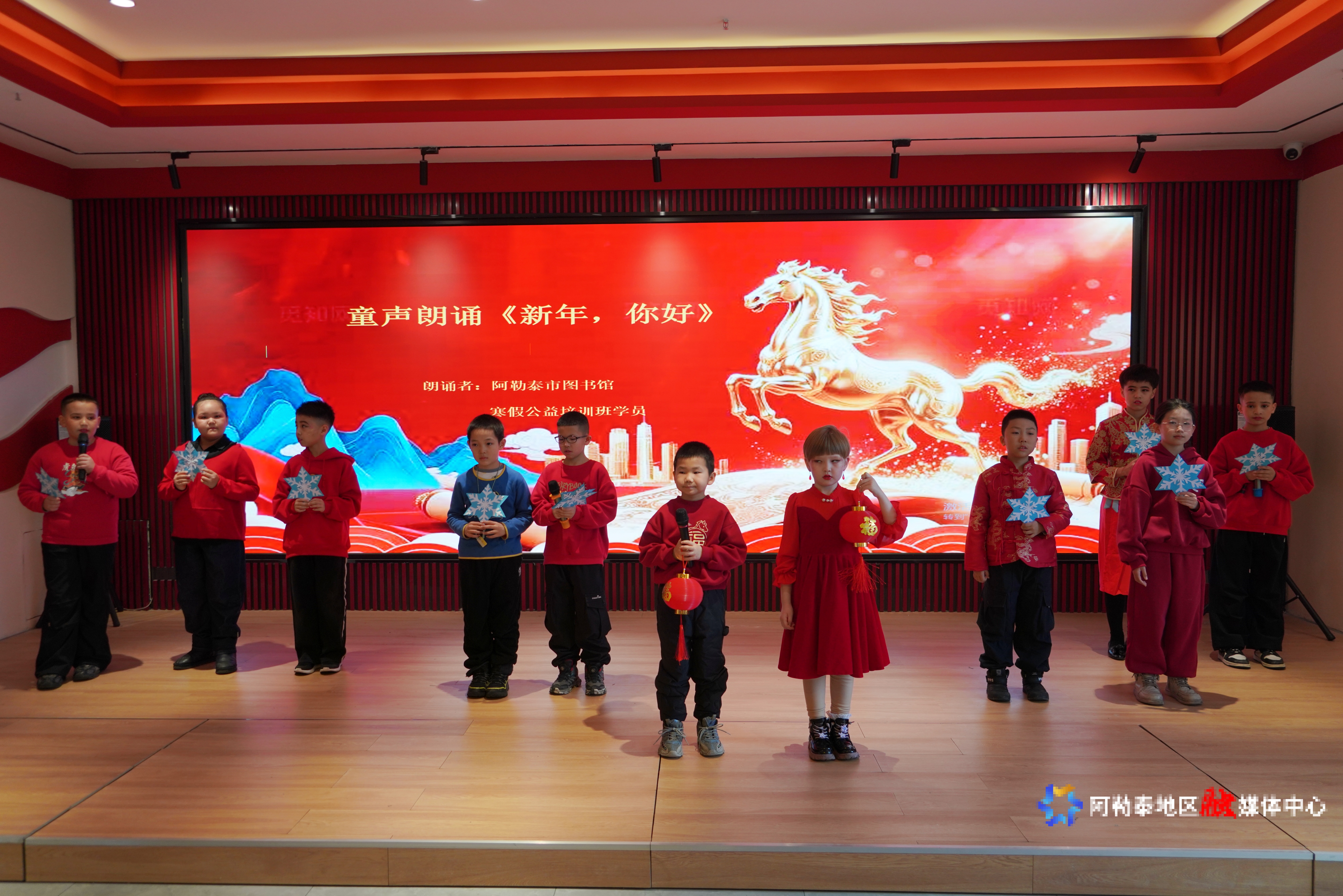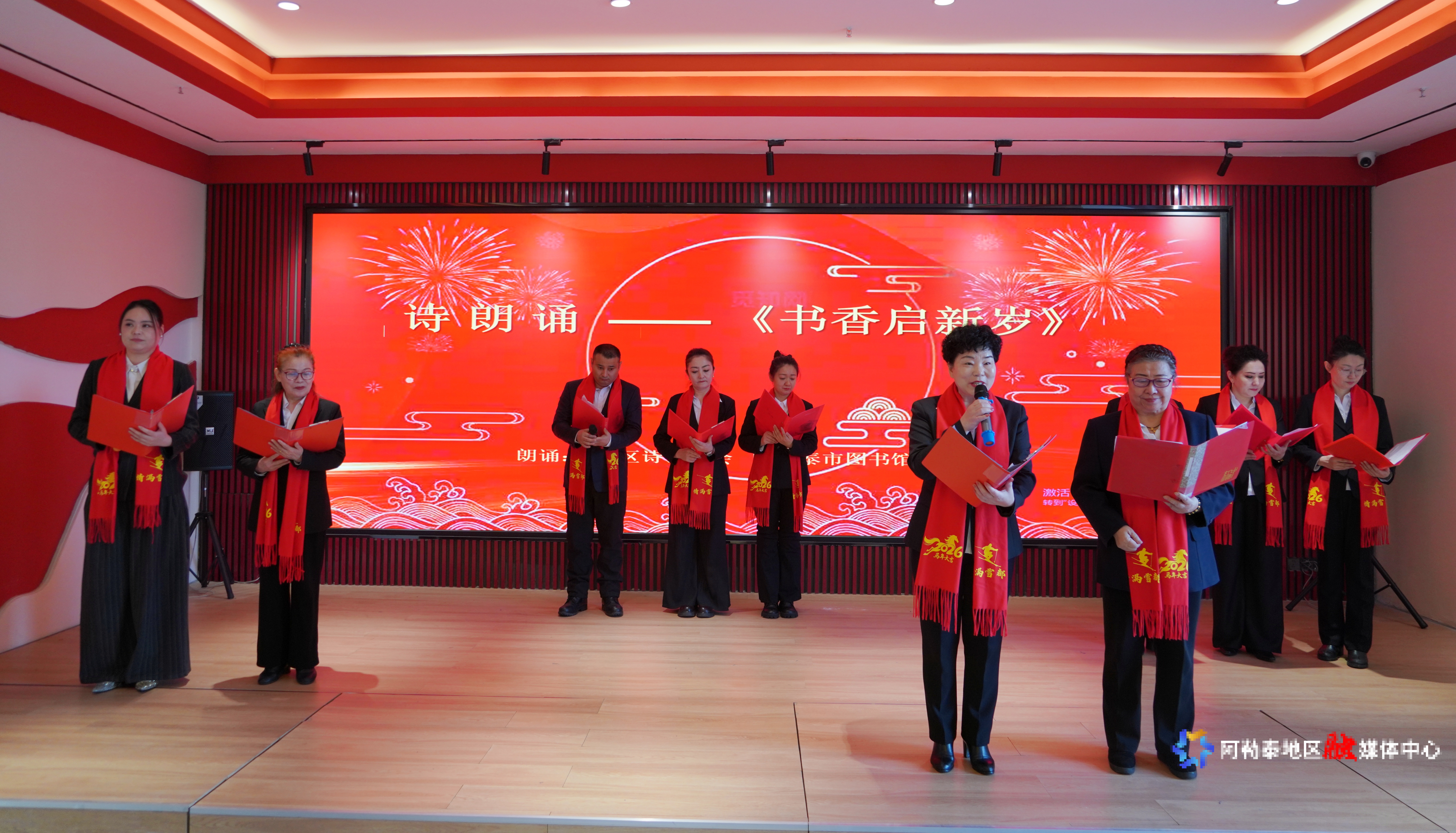 活动在《新年,你好》的童声朗诵中拉开序幕,11名孩子用稚嫩嗓音传递着对新年的期盼。文艺展演环节精彩纷呈:地区诗词协会与阿勒泰市图书馆联袂呈现配乐诗朗诵《书香启新岁》,让翰墨书香与新春祝福相映成趣;阿勒泰市实验小学教师栾江红演唱的《永远跟你走》,地区作家协会会员带来的集体舞《敬爱的毛主席》、诗歌朗诵《克兰河畔》,深情诠释了对党和祖国的无限热爱。