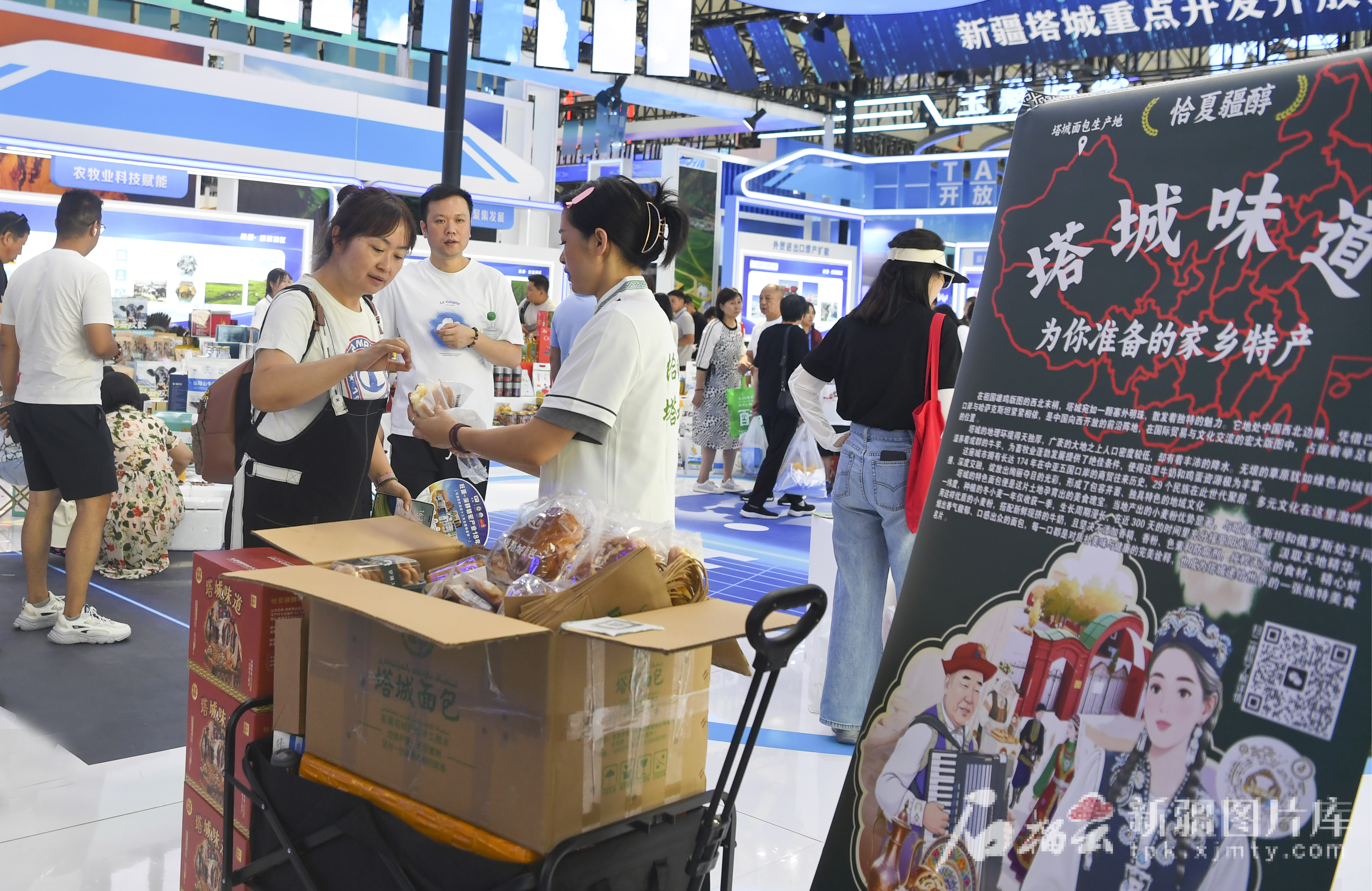 参观者在塔城展位品尝面包。
