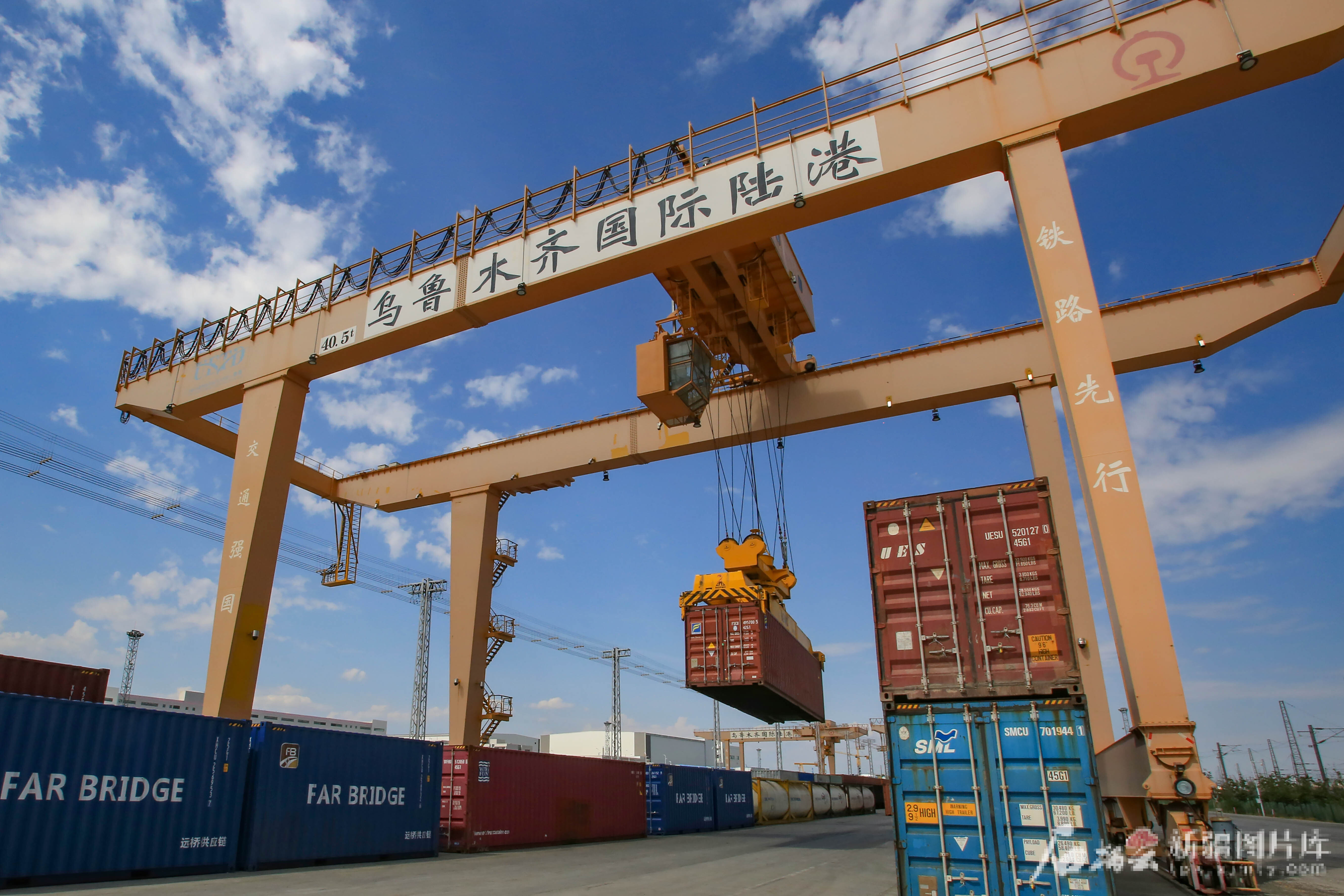 7月7日,乌鲁木齐国际陆港区中欧班列(乌鲁木齐)集结中心龙门吊正在吊运集装箱。截至6月30日,乌鲁木齐国际陆港区已累计始发班列9500余列,通达19个国家、26个城市。天山网-新疆日报记者韩亮摄