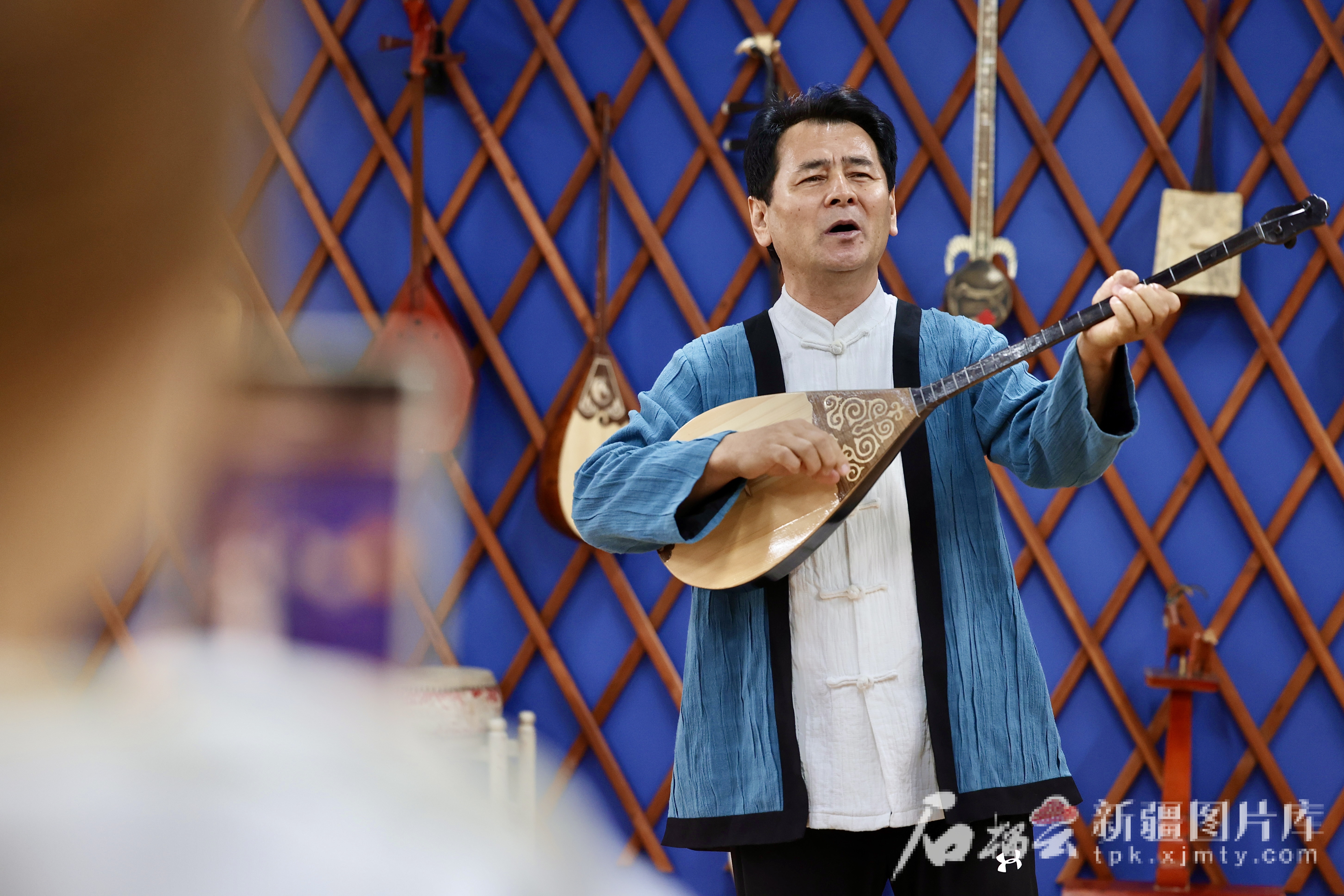 8月15日,博州歌舞团团长巴特尔在向记者介绍乐器。