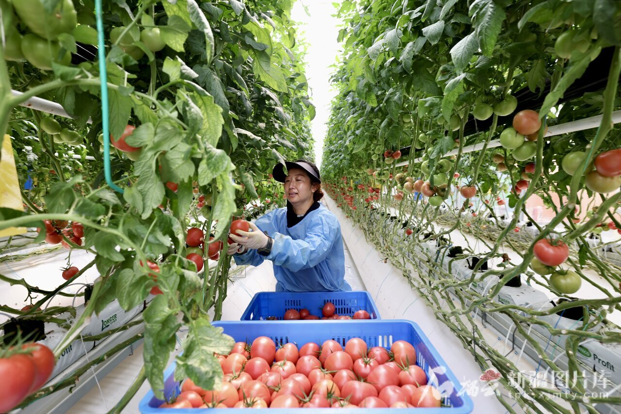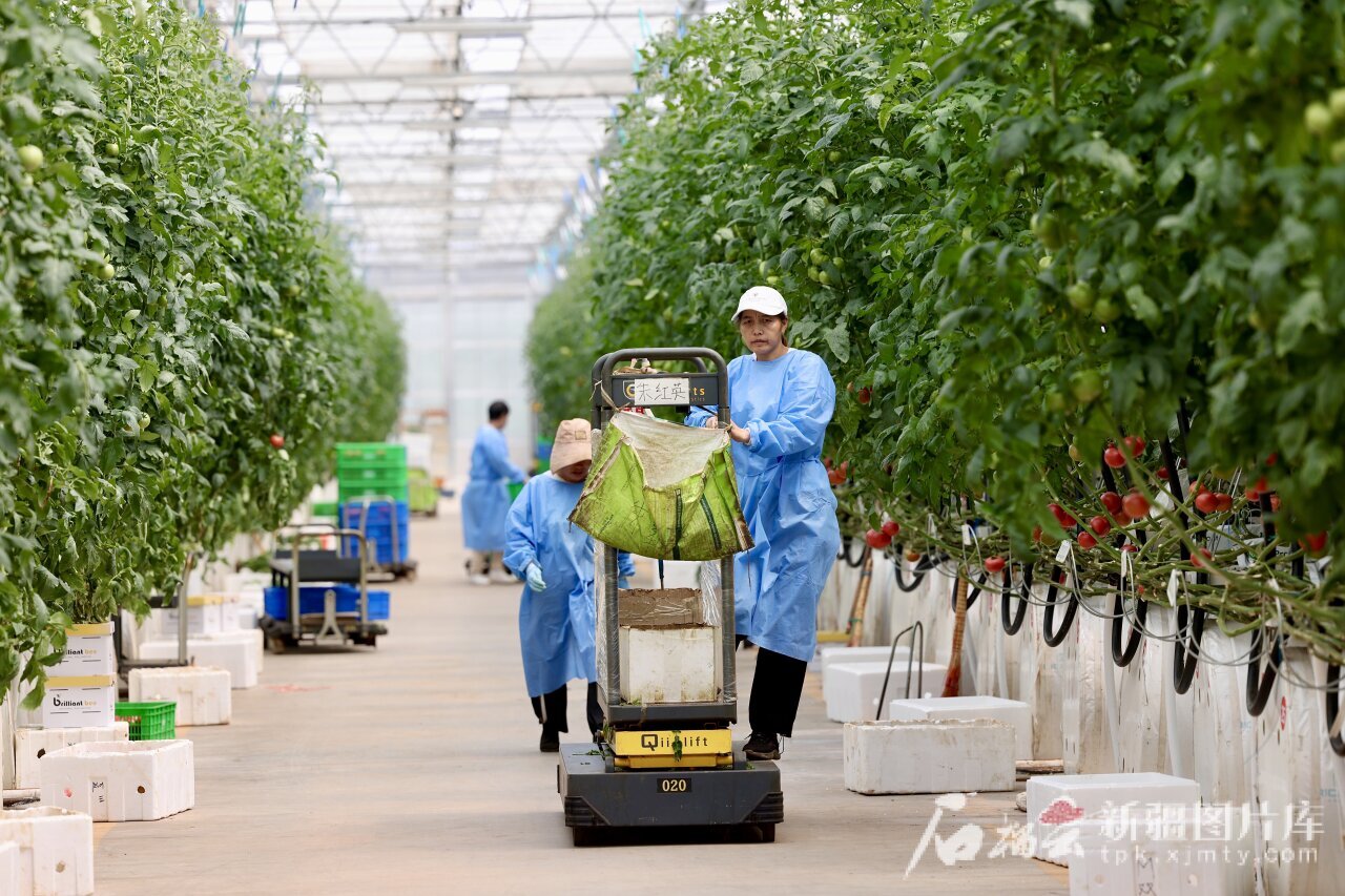 8月16日,霍尔果斯现代农业科技产业园智能大棚里,工作人员正在采摘番茄。