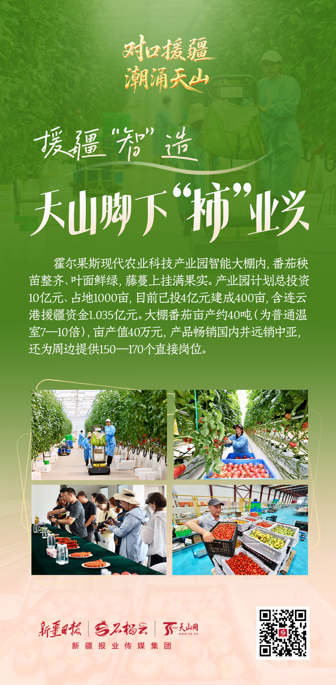 霍尔果斯现代农业科技产业园智能大棚内,番茄秧苗整齐、叶面鲜绿,藤蔓上挂满果实。产业园计划总投资10亿元、占地1000亩,目前已投4亿元建成400亩,含连云港援疆资金1.035亿元。大棚番茄亩产约40吨(为普通温室7—10倍),亩产值40万元,产品畅销国内并远销中亚,还为周边提供150—170个直接岗位。