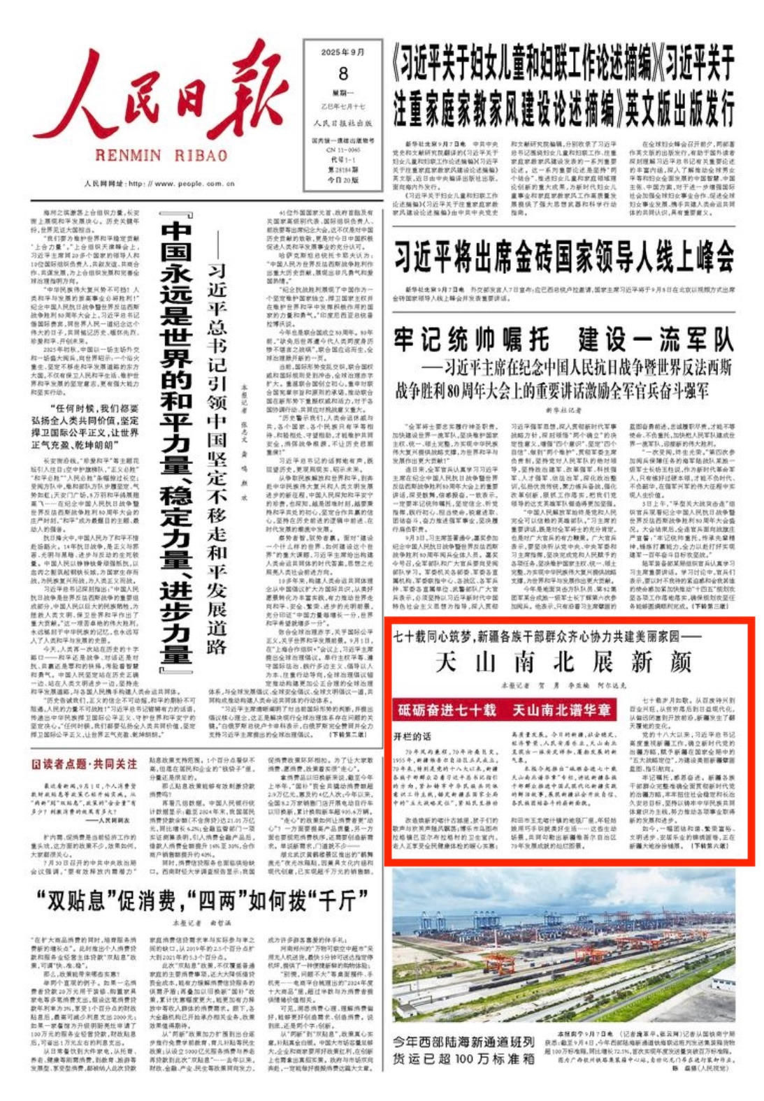 人民日报今起推出“砥砺奋进七十载 天山南北谱华章”专栏,讲述新疆各族干部群众推进中国式现代化新疆实践的鲜活故事,展现新疆社会开放自信、各民族团结奋斗的崭新面貌。