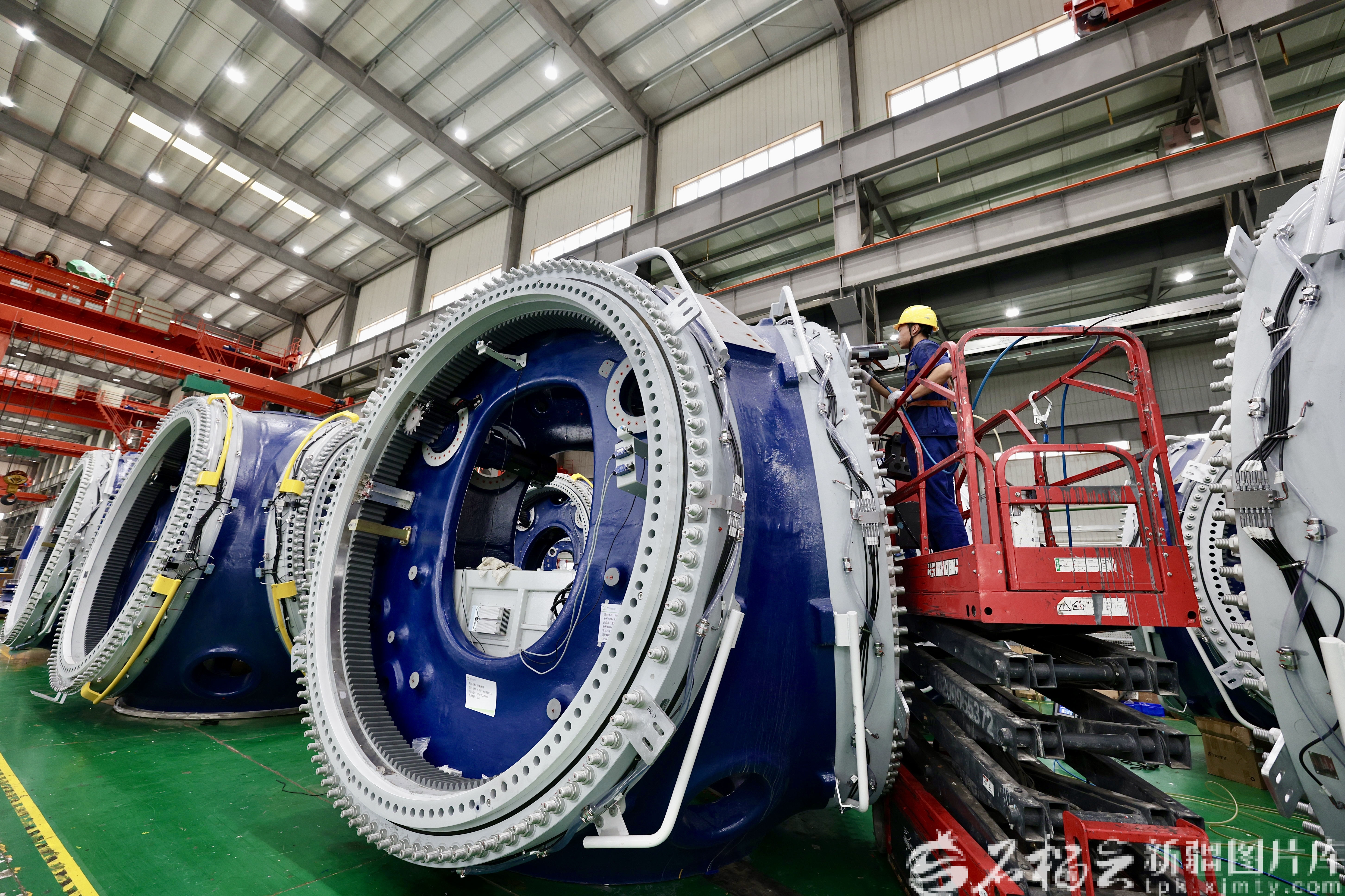9月9日,粤新绿色(新疆)能源集团有限公司的总装车间,工作人员正在组装风车轮毂。
