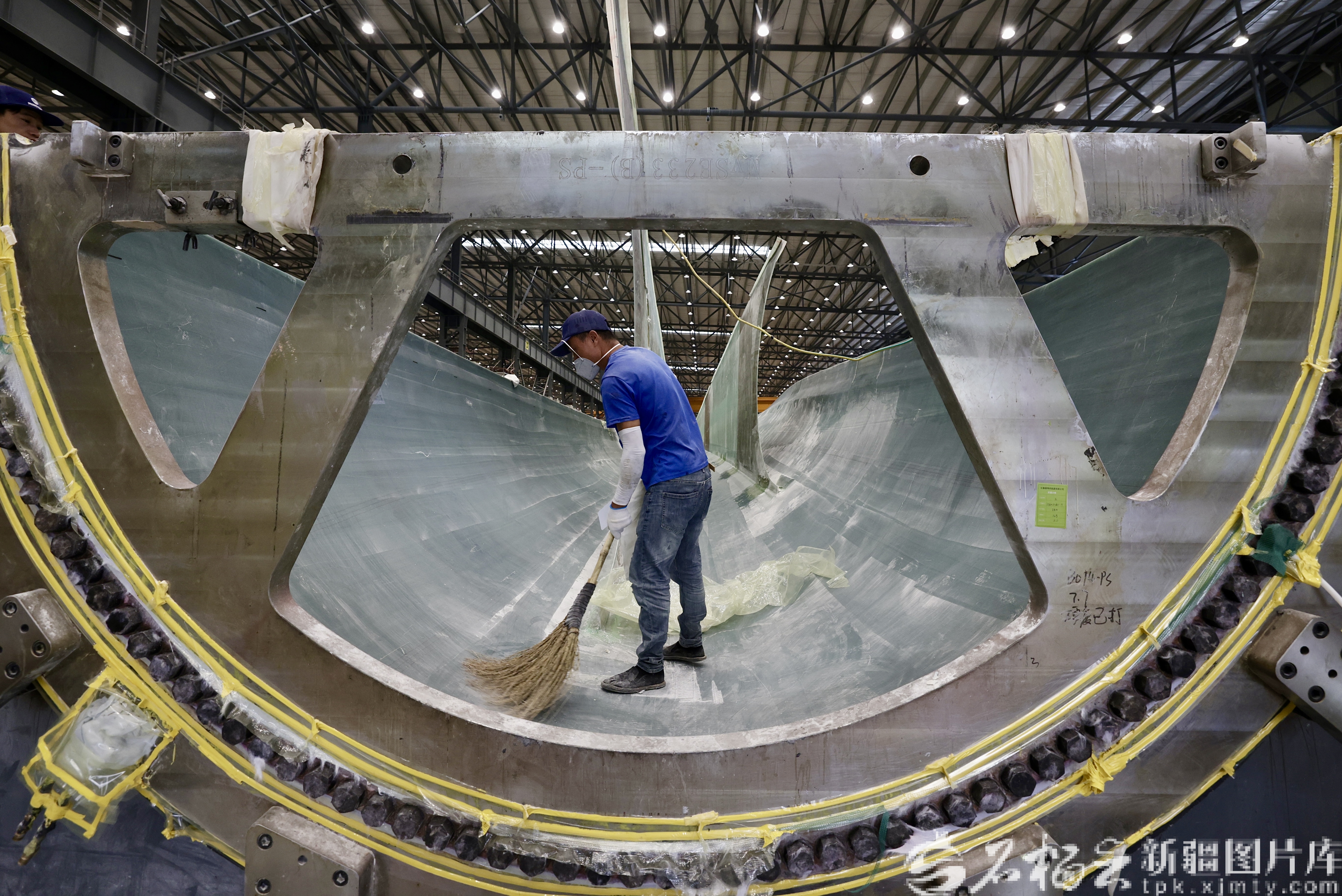 9月9日,粤新绿色(新疆)能源集团有限公司的风电设备生产车间,工作人员正在风叶生产线上作业。