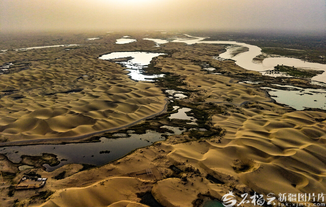 9月10日,航拍位于尉犁县墩阔坦乡的罗布人村寨景区美景。