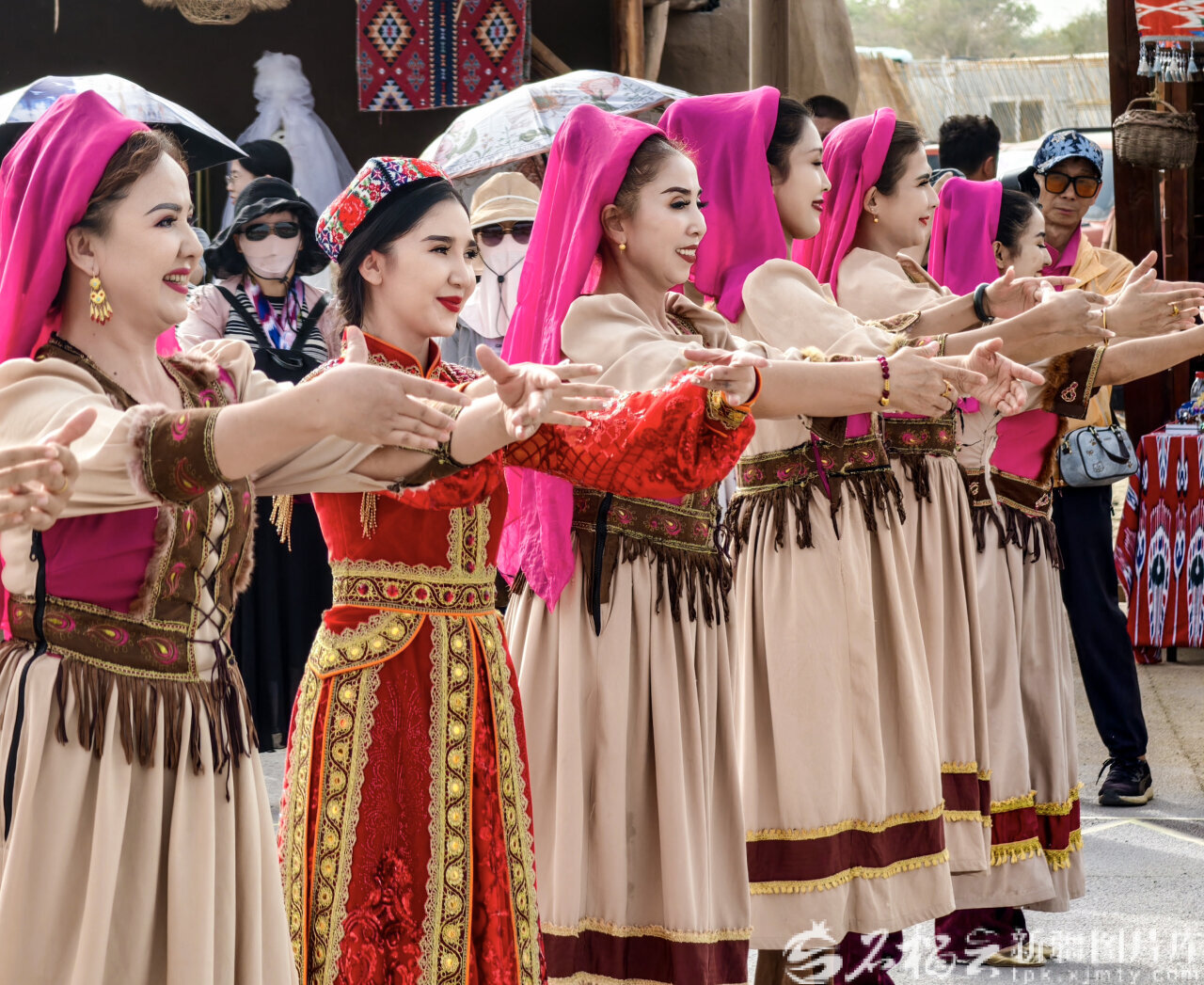 9月10日,游客在位于尉犁县墩阔坦乡的罗布人村寨景区观看表演。