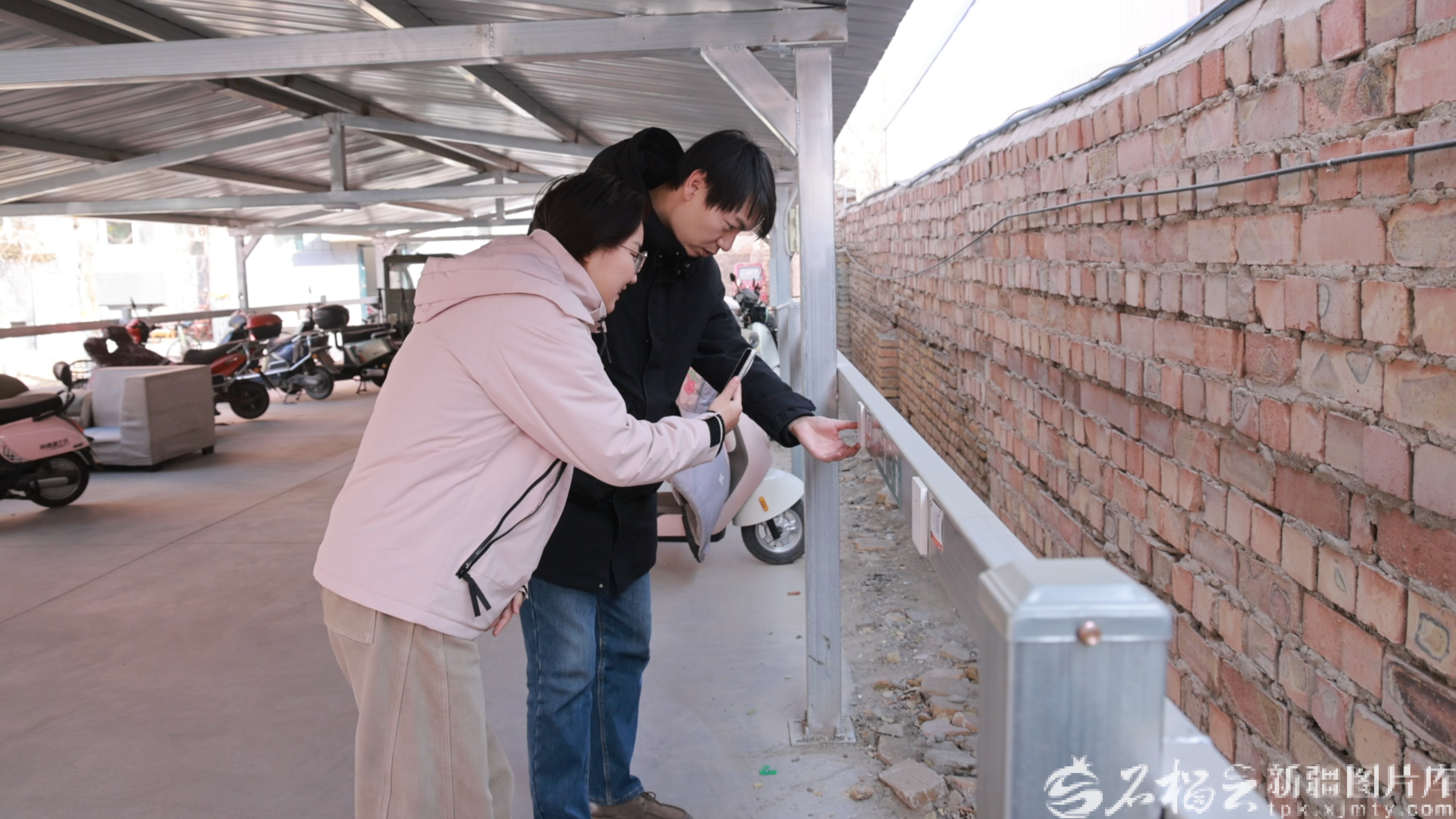 1月13日,新疆生产建设兵团第二师铁门关市民政事务服务中心工作人员检查新修建的车棚安全用电情况。王云鹏摄