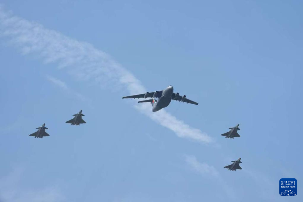 9月12日,第十二批在韩中国人民志愿军烈士遗骸回国。这是在沈阳桃仙国际机场,接运烈士遗骸回国的运-20专机在4架歼-20飞机伴飞护航下即将降落。新华社记者 潘昱龙 摄