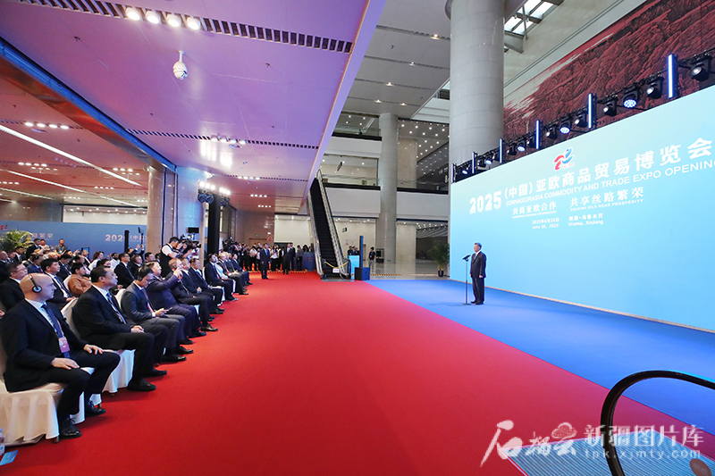 天山网-新疆日报讯(记者王兴瑞报道)6月26日,以“共商亚欧合作 共享丝路繁荣”为主题的2025(中国)亚欧商品贸易博览会在新疆国际会展中心开馆。自治区党委书记马兴瑞出席活动并宣布开馆。自治区党委副书记、自治区主席艾尔肯·吐尼亚孜致欢迎辞。
