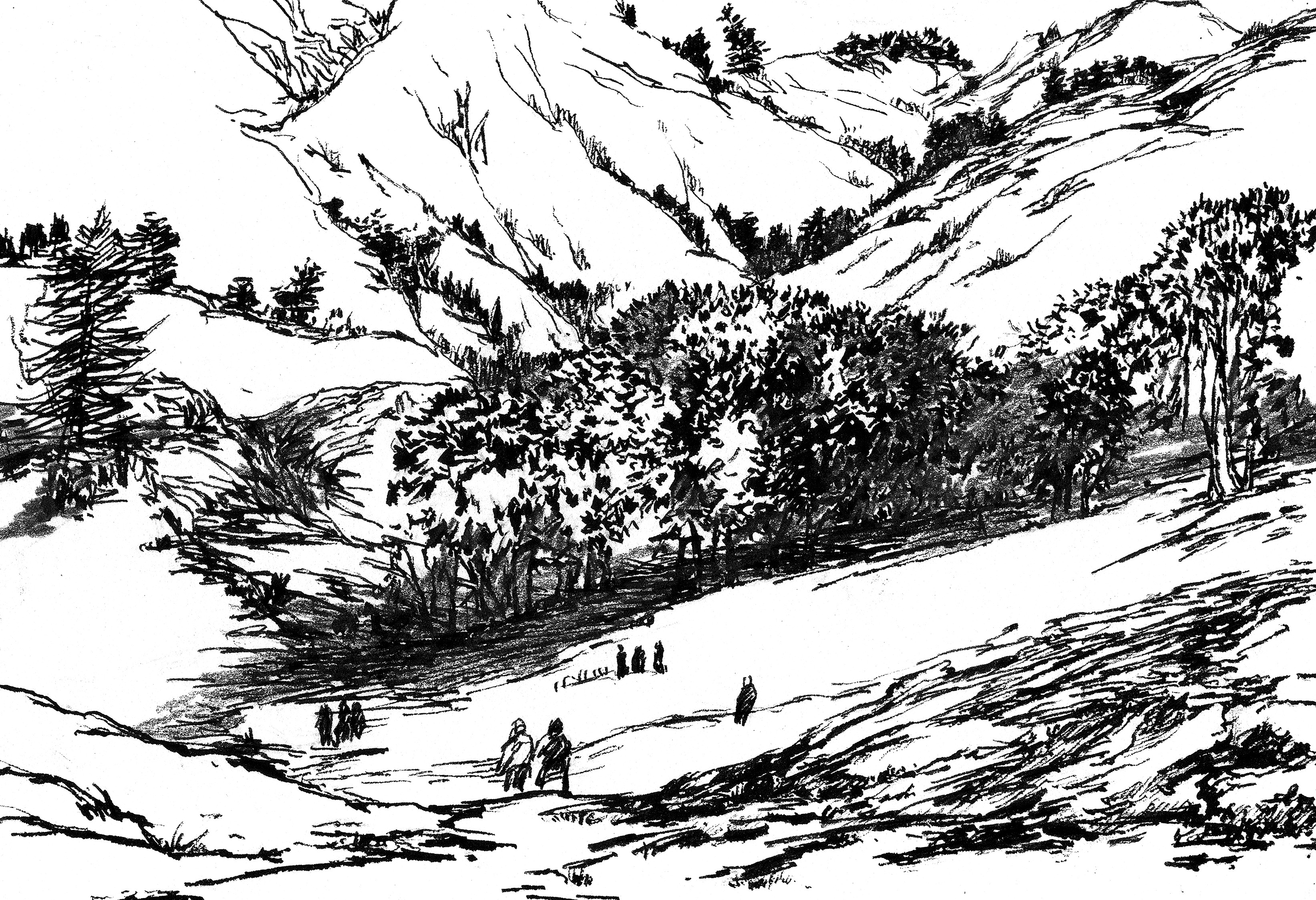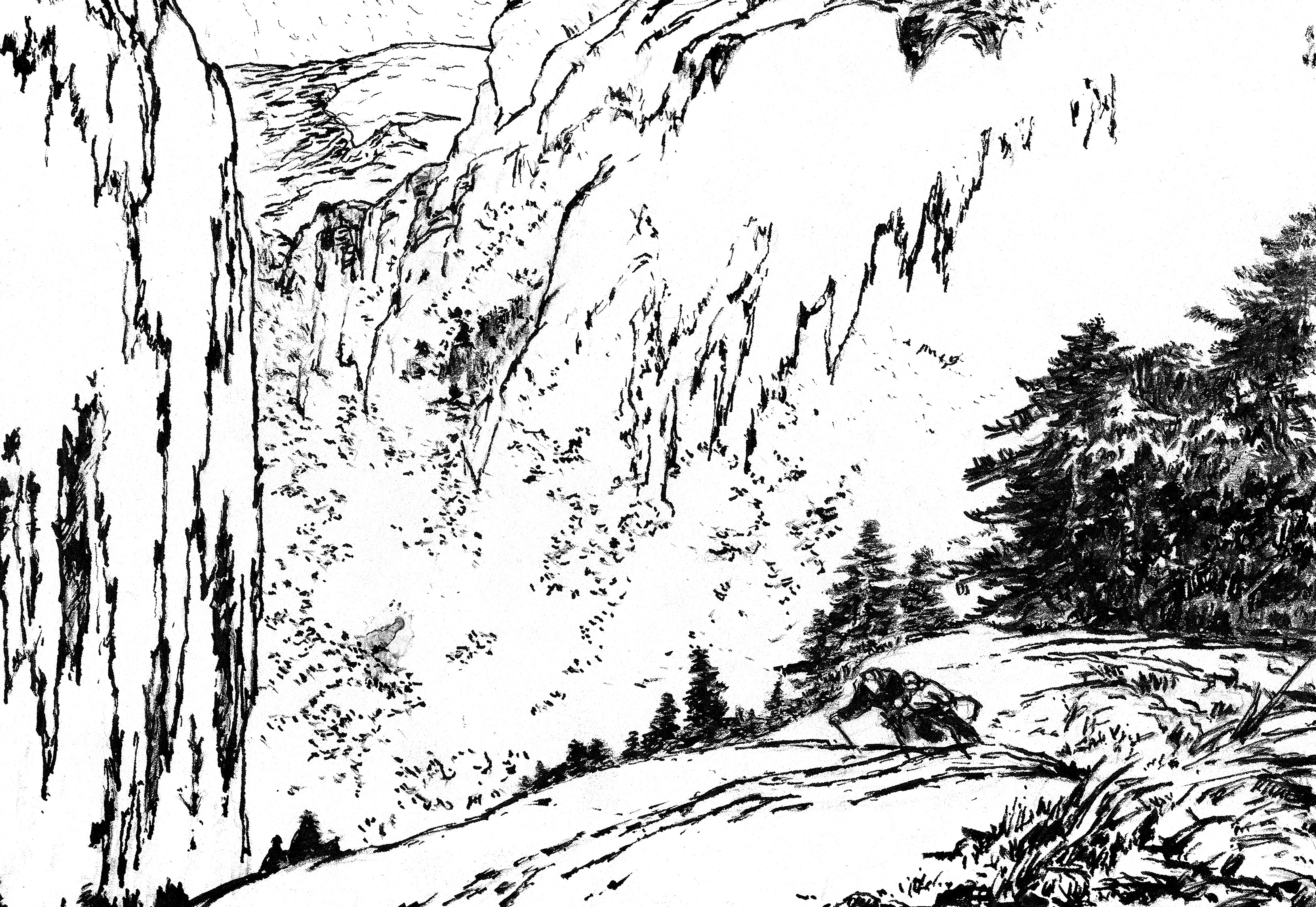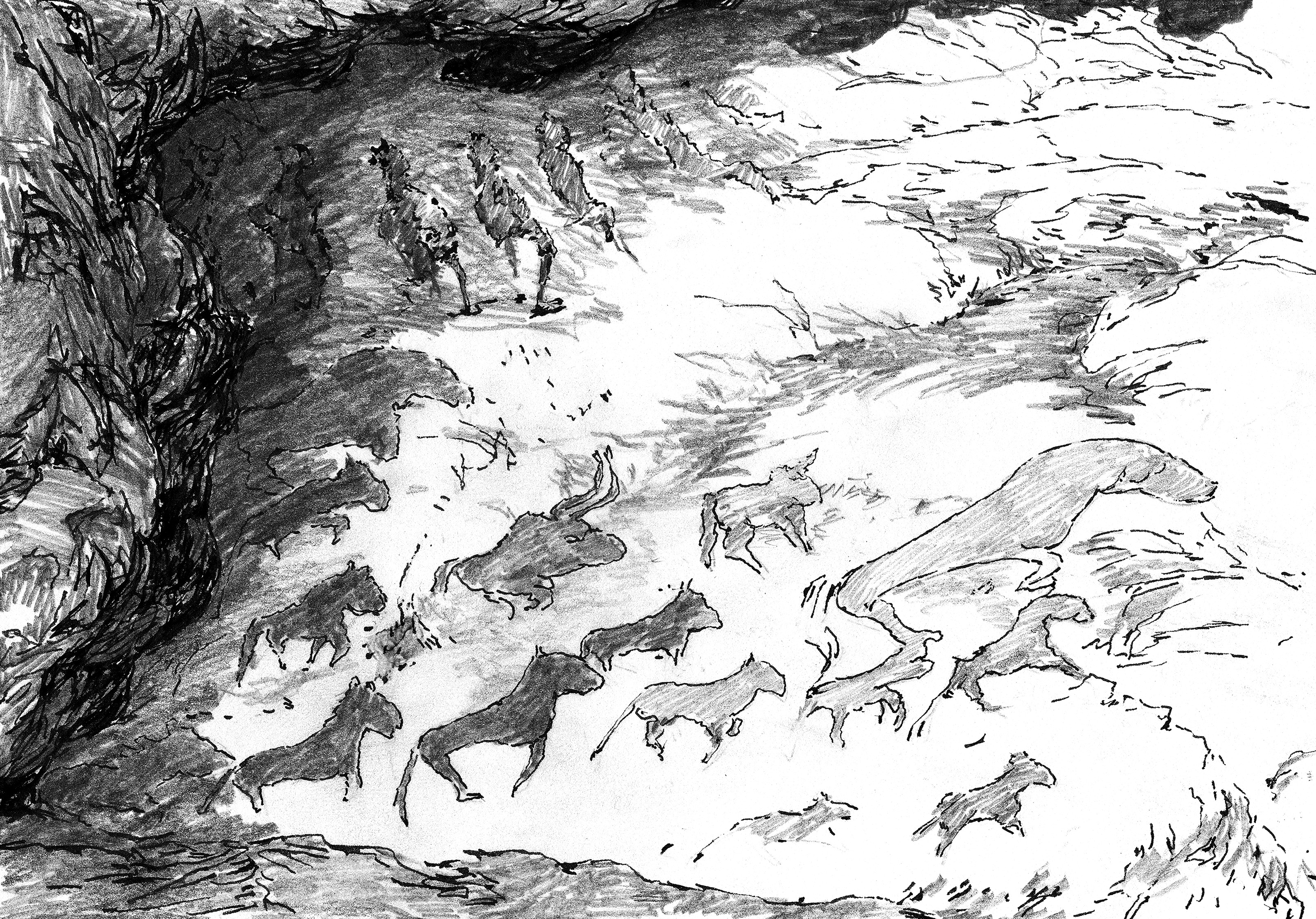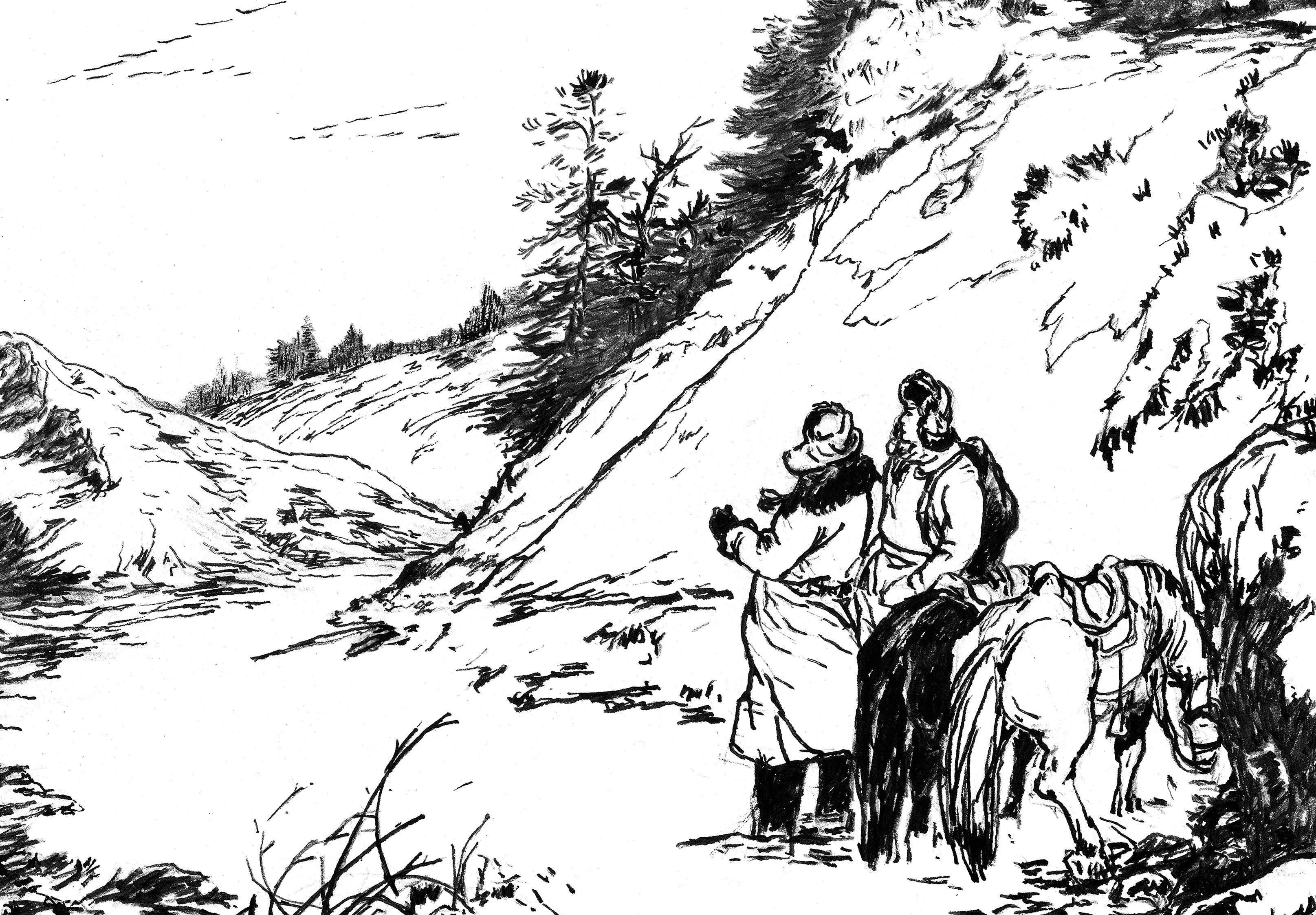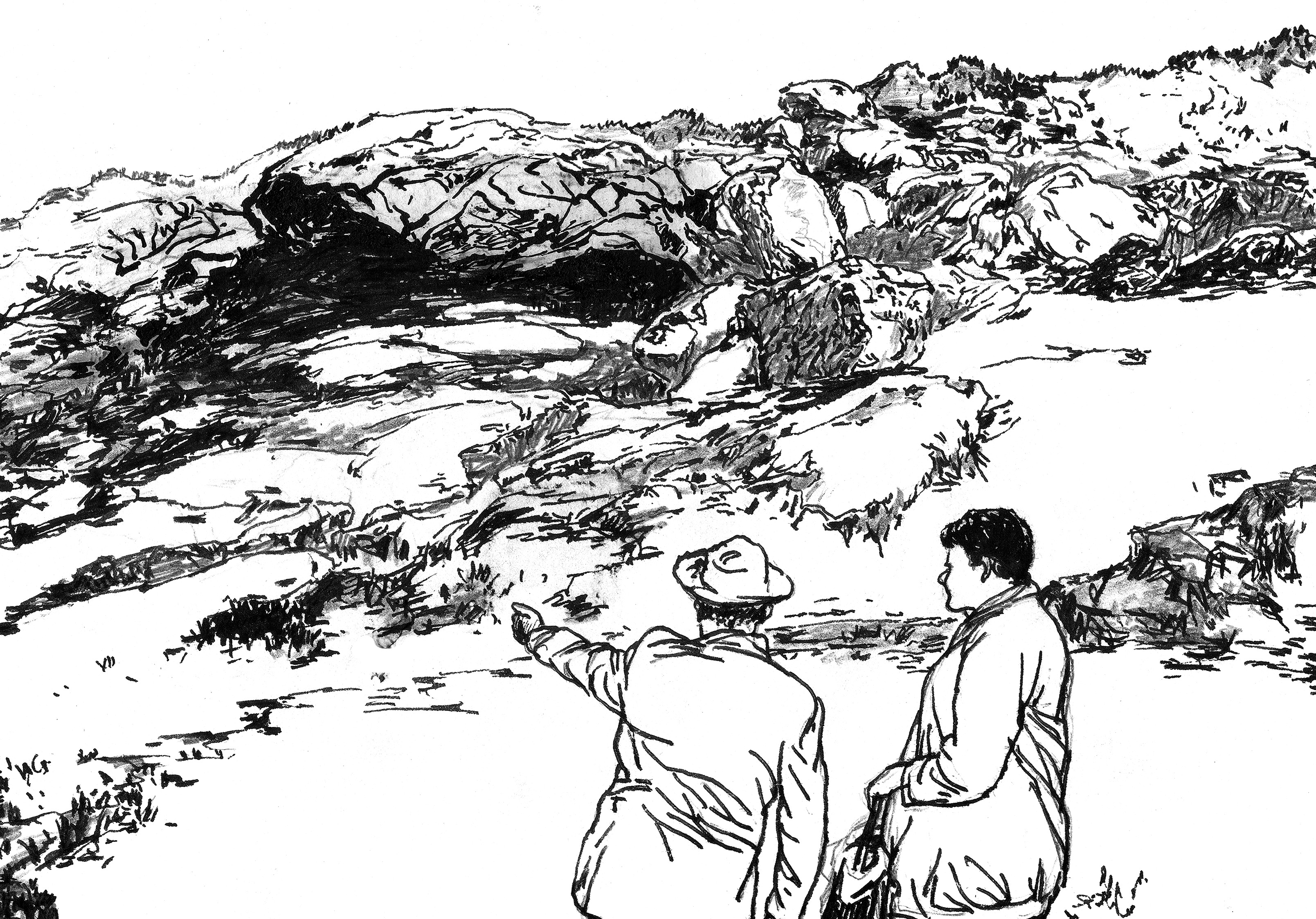 2 从小东沟向北深入20余公里,抵达乌齐里克,再向东直达五指泉。这两条大峡谷连接着拉斯特和汗德尕特。那幅最负盛名的人类滑雪起源的岩棚画,就坐落于汗德尕特以东的敦德布拉克。