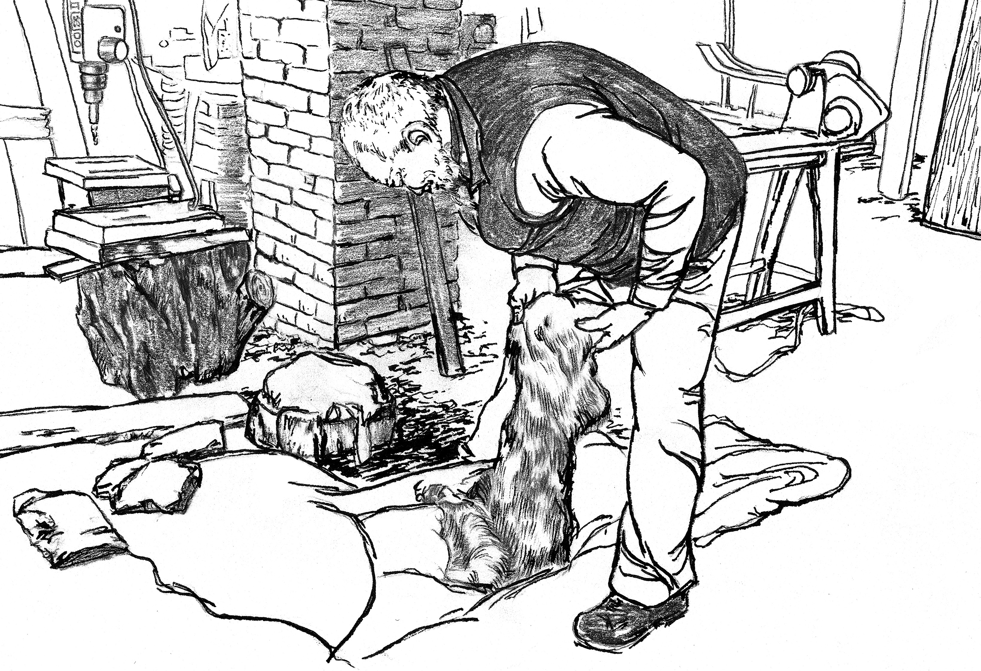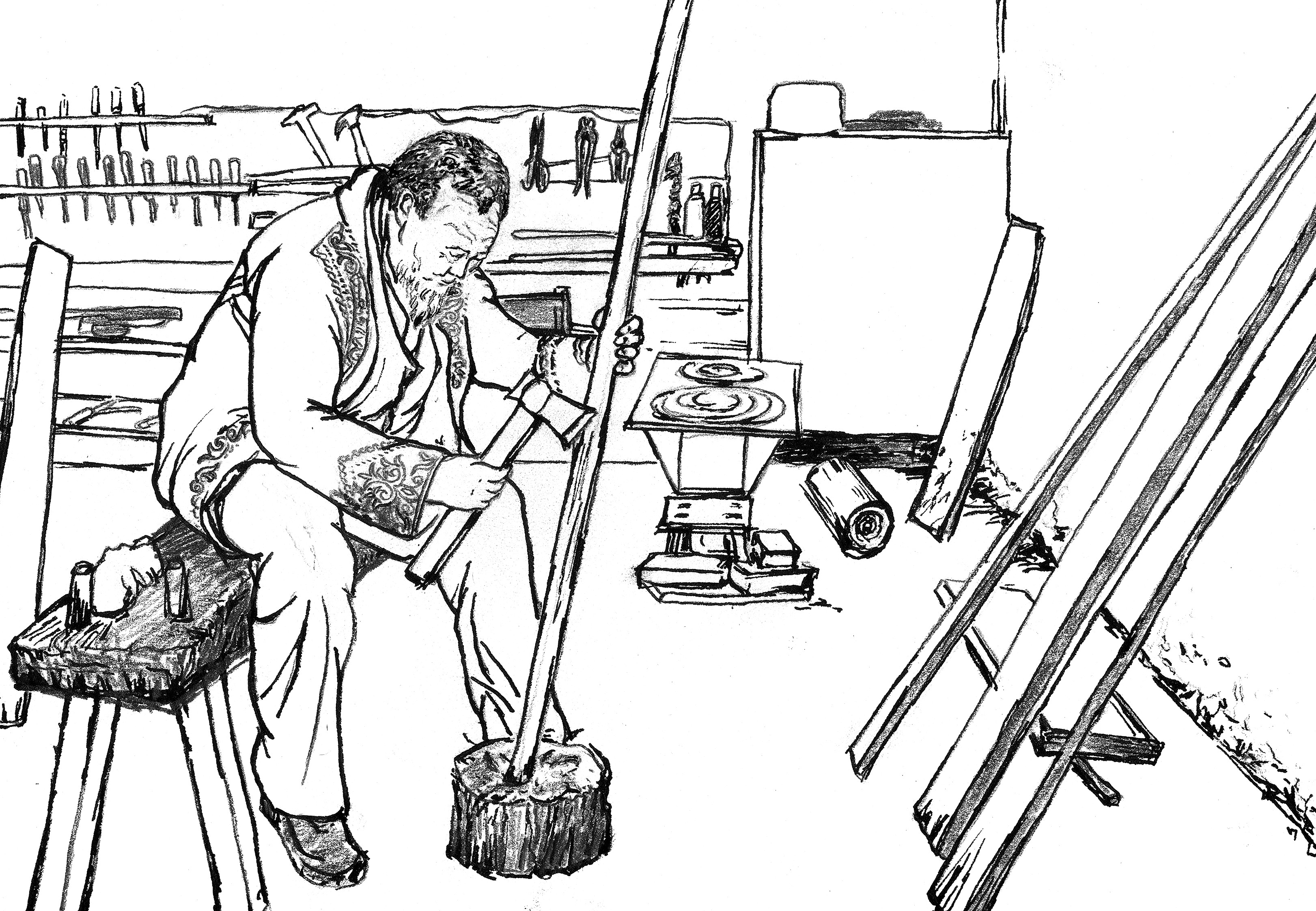 9 抛光木板后,蒸煮板头,将其弯折成150度的钝角。木板中部打眼穿皮绳以便于固定前脚掌,将熟好的马皮附在木板上进行晾晒,毛皮在收缩过程中紧紧包裹木板,从而实现不脱落。