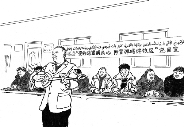 53 每次宣讲结束后,总有群众拉着马丁别克的手,说:“你们的宣讲,我们喜欢听、能听懂,越听越想听,希望你们能多来讲一讲。”马丁别克也因此被群众亲切地称为“无屏幕的电视机,能对话的收音机”。