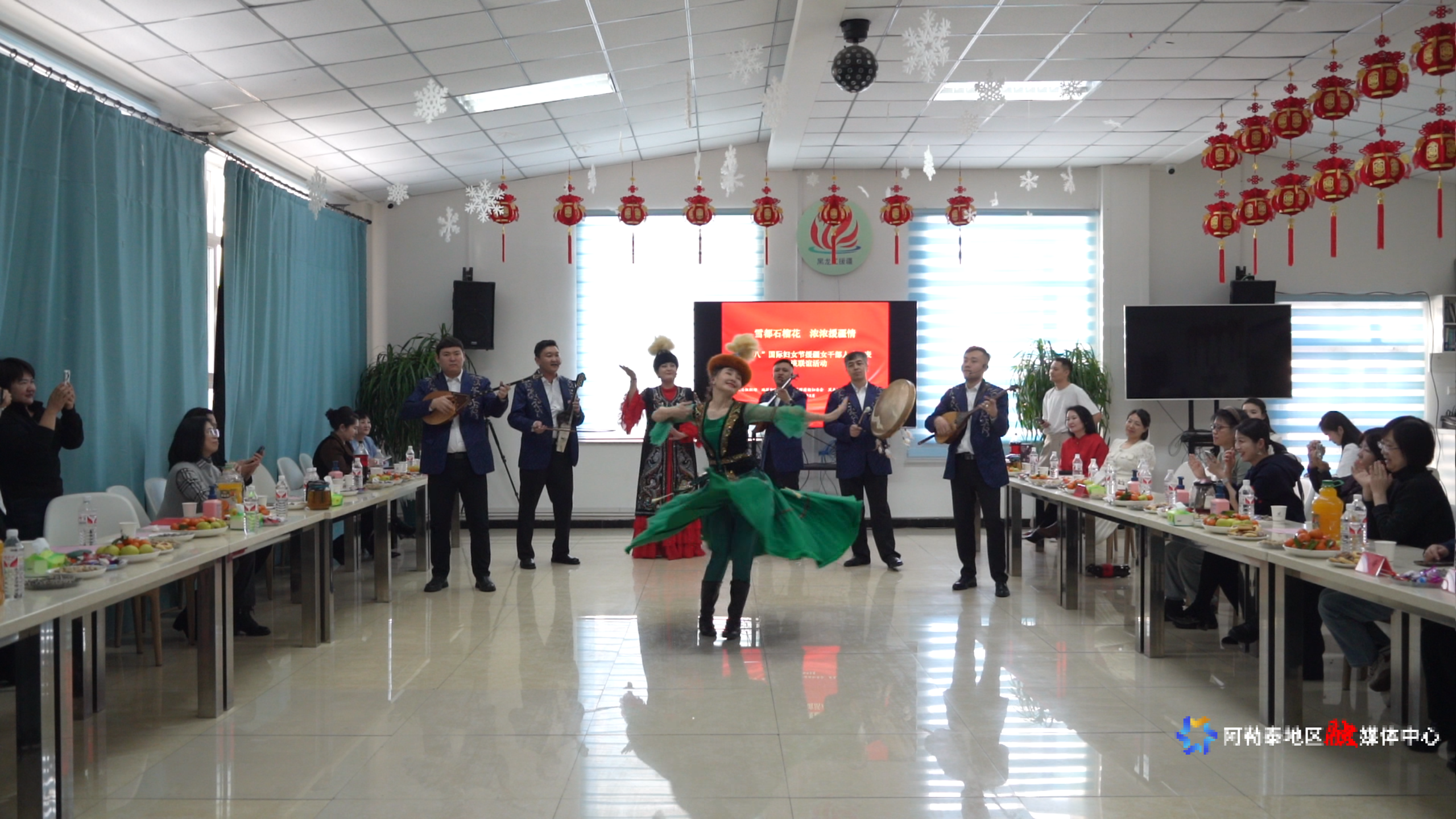 在联谊互动环节,阿勒泰雪都文化演艺有限责任公司带来的集体舞《喜悦》、女声独唱《草原夜色美》、男声独唱《玩转阿勒泰》、歌舞表演《黑走马》等节目精彩纷呈。援疆女干部人才也积极奉上歌曲《我的阿勒泰》《苹果香》《如愿》《援友》以及诗朗诵《石榴花开别样红》等节目,现场欢呼声与掌声不断,大家在欢声笑语中尽享节日快乐。