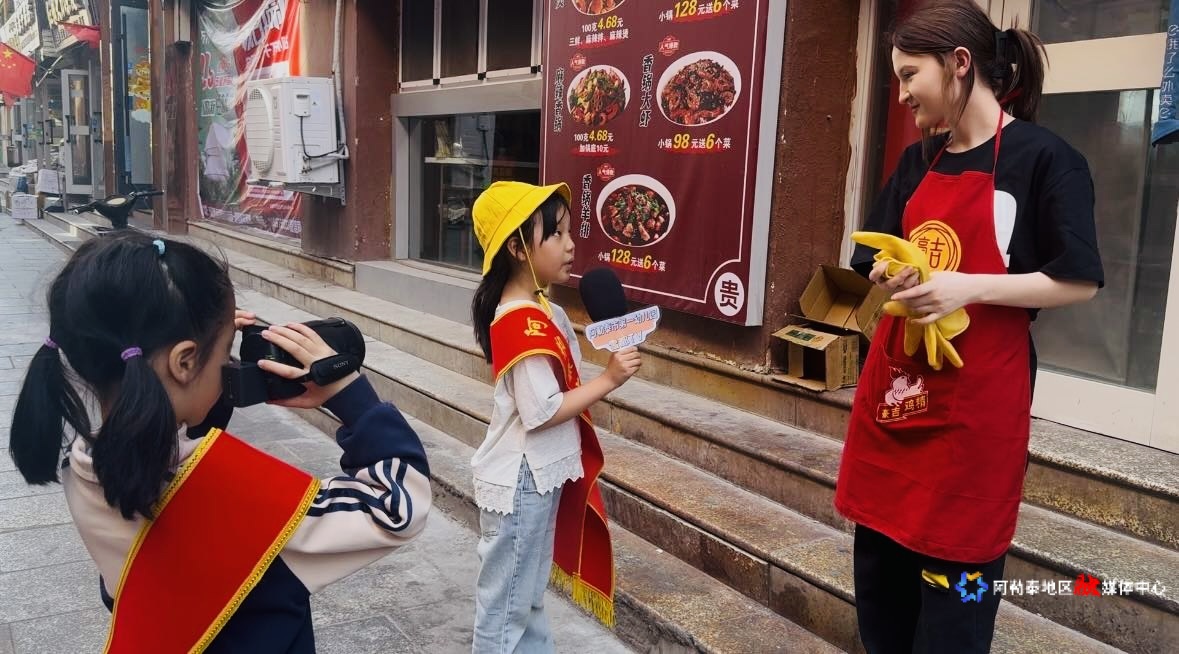 活动当日,萌娃们手持摄像机和话筒,礼貌地走向环卫工人、人民警察、商铺店员等不同岗位的劳动者。