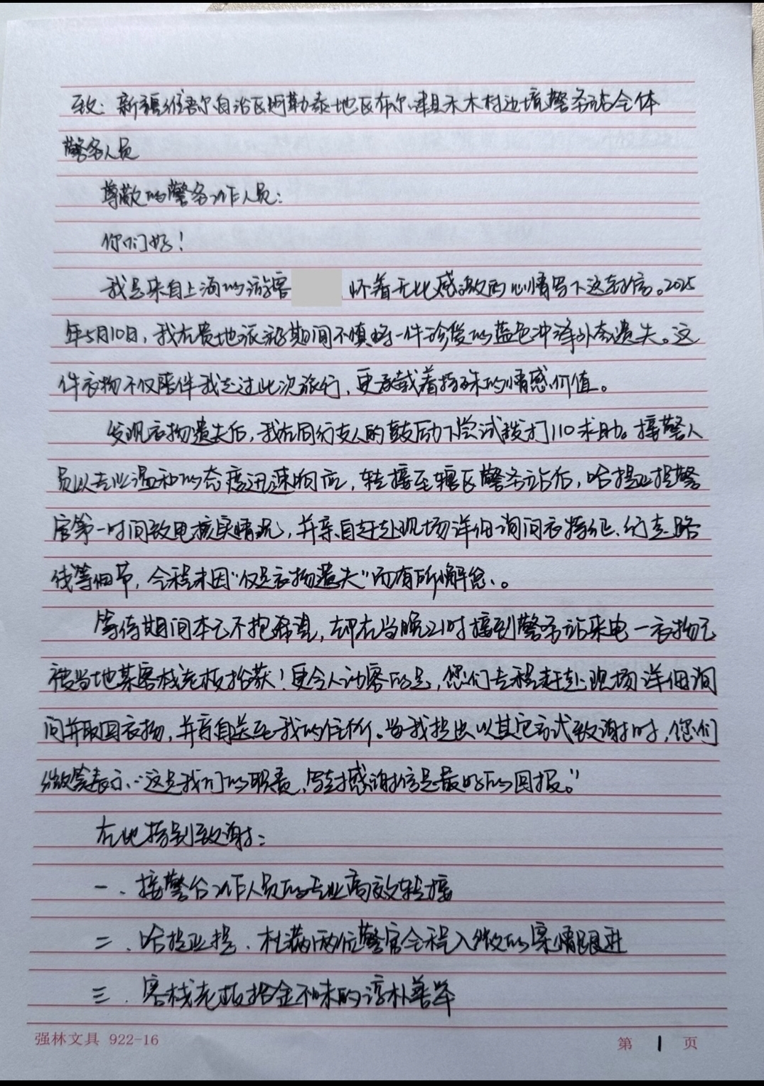 阿勒泰新闻网-阿勒泰地区融媒体中心(实习记者 王景鸿)“没想到一件小事,民警却如此放在心上!”近日,禾木边境派出所民警高效帮助游客找回遗失衣物的暖心故事,通过一封发布在小红书的感谢信引发关注。信中,游客用真挚笔触记录了民警帮其找回遗失物品的详细过程。