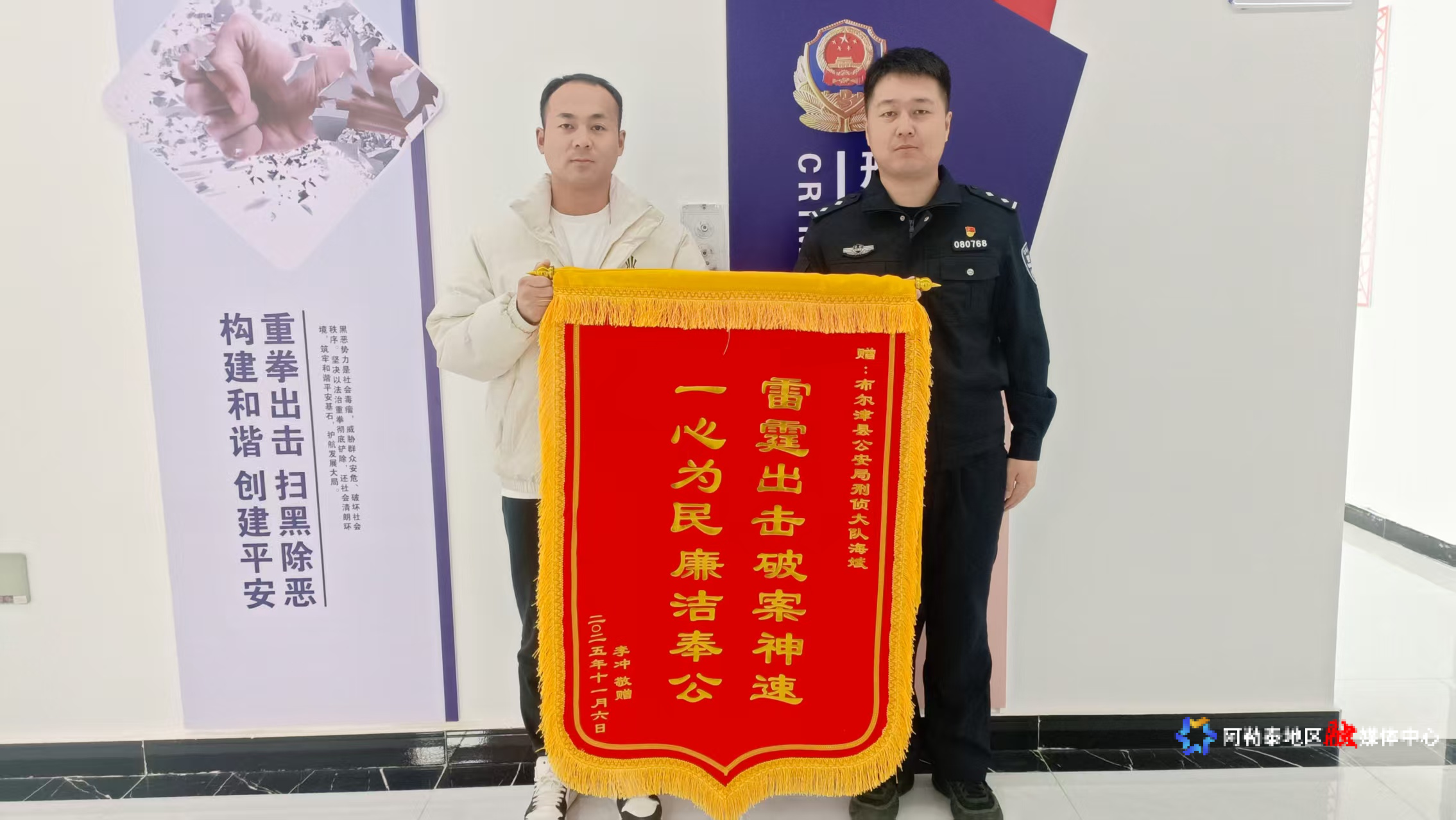 阿勒泰新闻网-阿勒泰地区融媒体中心(记者 古扎丽·阿布都热西提 通讯员 鲍婷)近日,布尔津县辖区群众李某将一面印有“雷霆出击破案神速 一心为民廉洁公正”字样的锦旗送到县公安局刑侦大队,为警方快速追回被骗的3.3万元房款点赞。