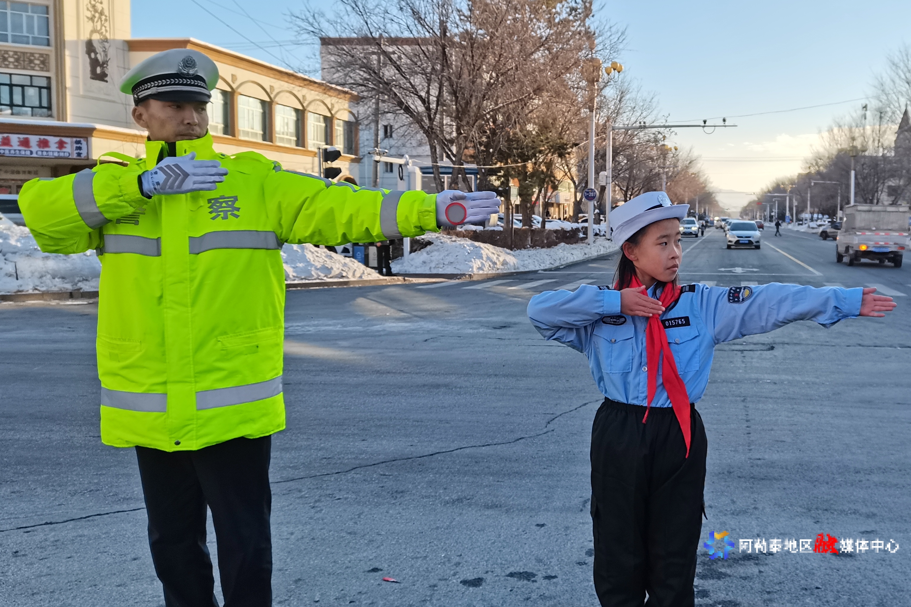 最令人期待的是“沉浸式执勤体验”环节,4名学生代表化身“小交警”,身着迷你警服、头戴交警帽,在民警的带领下,来到校园周边的交叉路口——有的向过往车辆驾驶员微笑提醒“请系好安全带”“骑电动车记得戴头盔”;有的协助民警核查车辆相关证件;有的主动搀扶老人安全通过斑马线;有的用稚嫩的声音向路人讲解交通安全要点,传递文明出行理念。