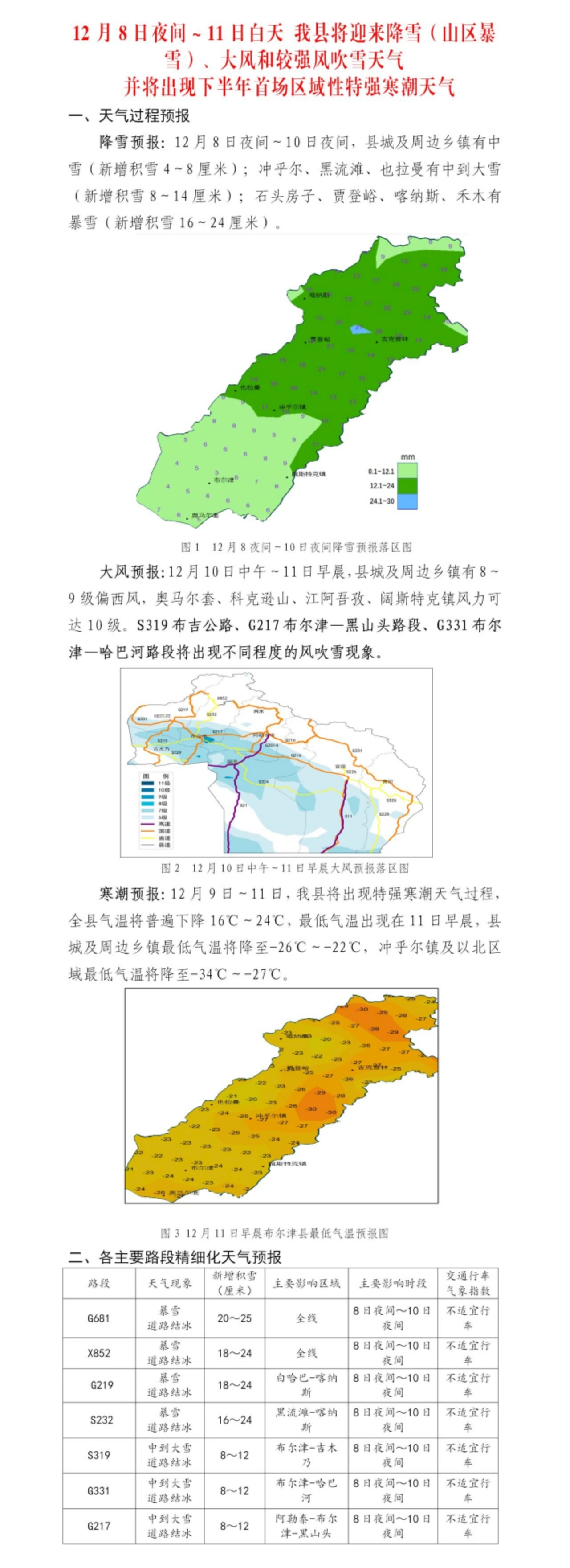 据布尔津县气象部门发布的最新气象信息,喀纳斯景区即将面临新一轮强降雪降温天气。原G219线白喀段、省道232线以及禾木x852线等主要道路将出现大面积积雪结冰现象。为了保障人民群众的生命财产安全,喀纳斯景区分局交通管理大队将依据天气变化情况,计划于2025年12月8日19时实施双向交通管制措施。