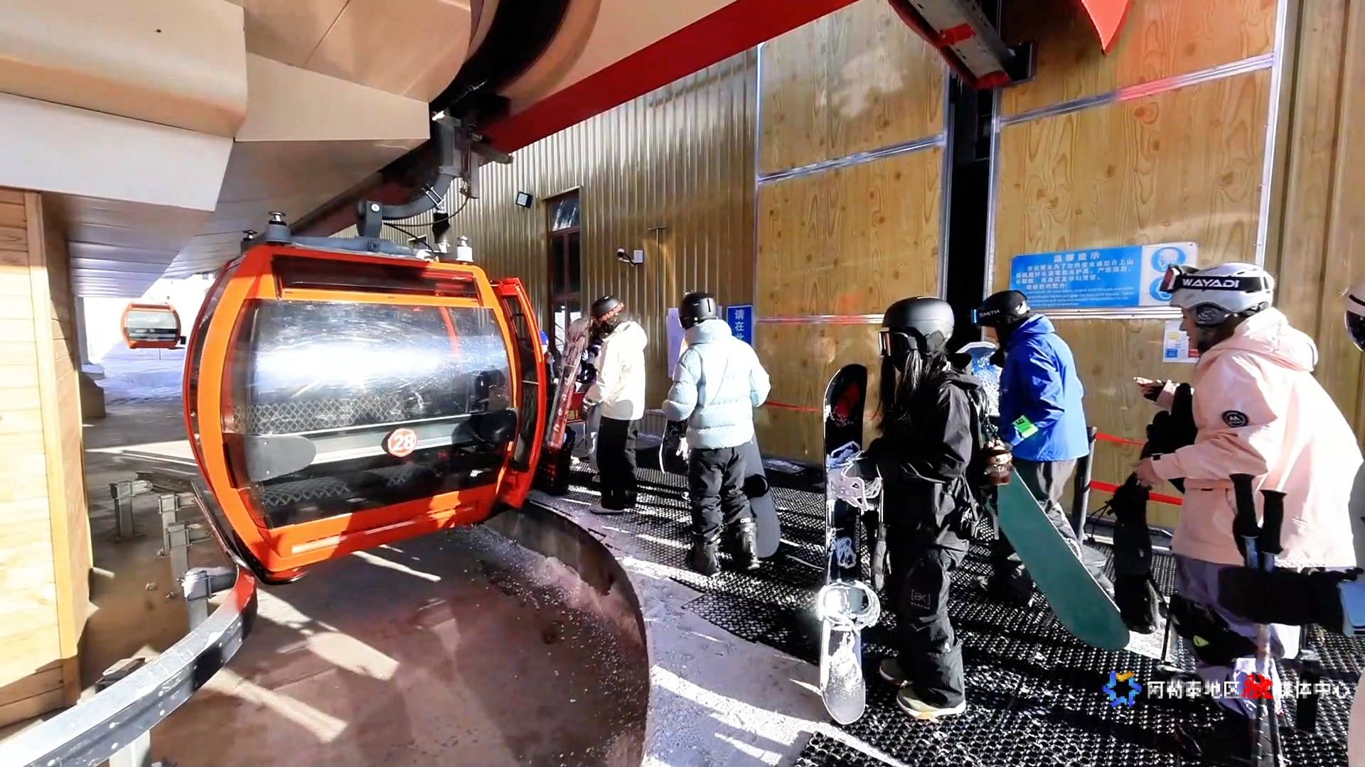 众多雪友在禾木吉克普林国际滑雪度假区乘坐缆车上雪道。