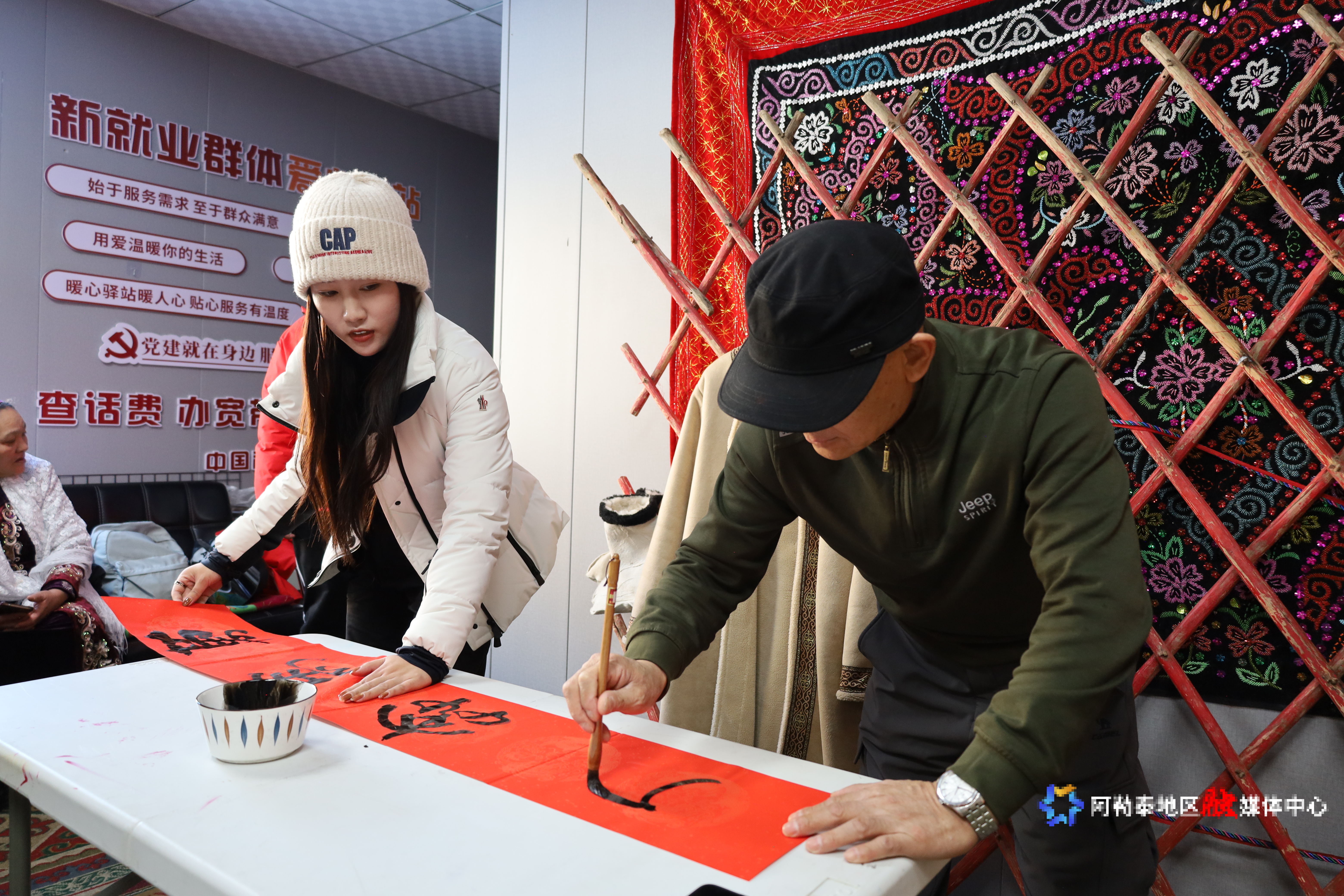 活动在女子双人舞《圆月》中拉开序幕,冬不拉弹奏《春天》与呼麦表演《黑走马》相继登场,让雪友沉浸式感受本土艺术魅力。现场设有书法与刺绣体验区,雪友既可获取满载祝福的春联,也能在妇女代表指导下穿针引线,领略传统手工艺的韵味。