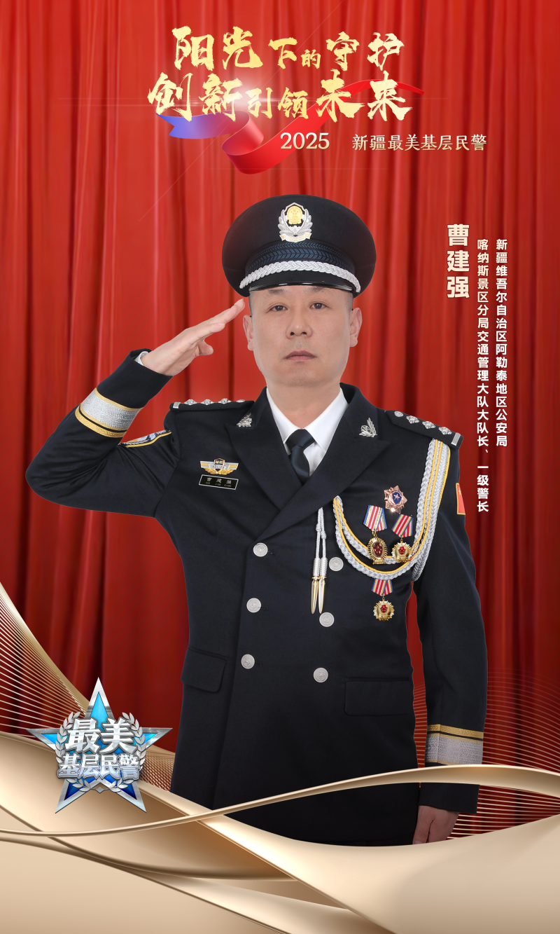 阿勒泰新闻网-阿勒泰地区融媒体中心(记者 古扎丽·阿布都热西提)1月8日,第六个中国人民警察节前夕,自治区公安厅举行新疆公安机关中国人民警察节主题新闻通气会。会上,自治区党委宣传部、自治区公安厅联合授予20名民警2025年新疆“最美基层民警”称号,阿勒泰地区公安局喀纳斯景区分局交通管理大队大队长、一级警长曹建强光荣入选,以戍边坚守为警徽增光添彩。
