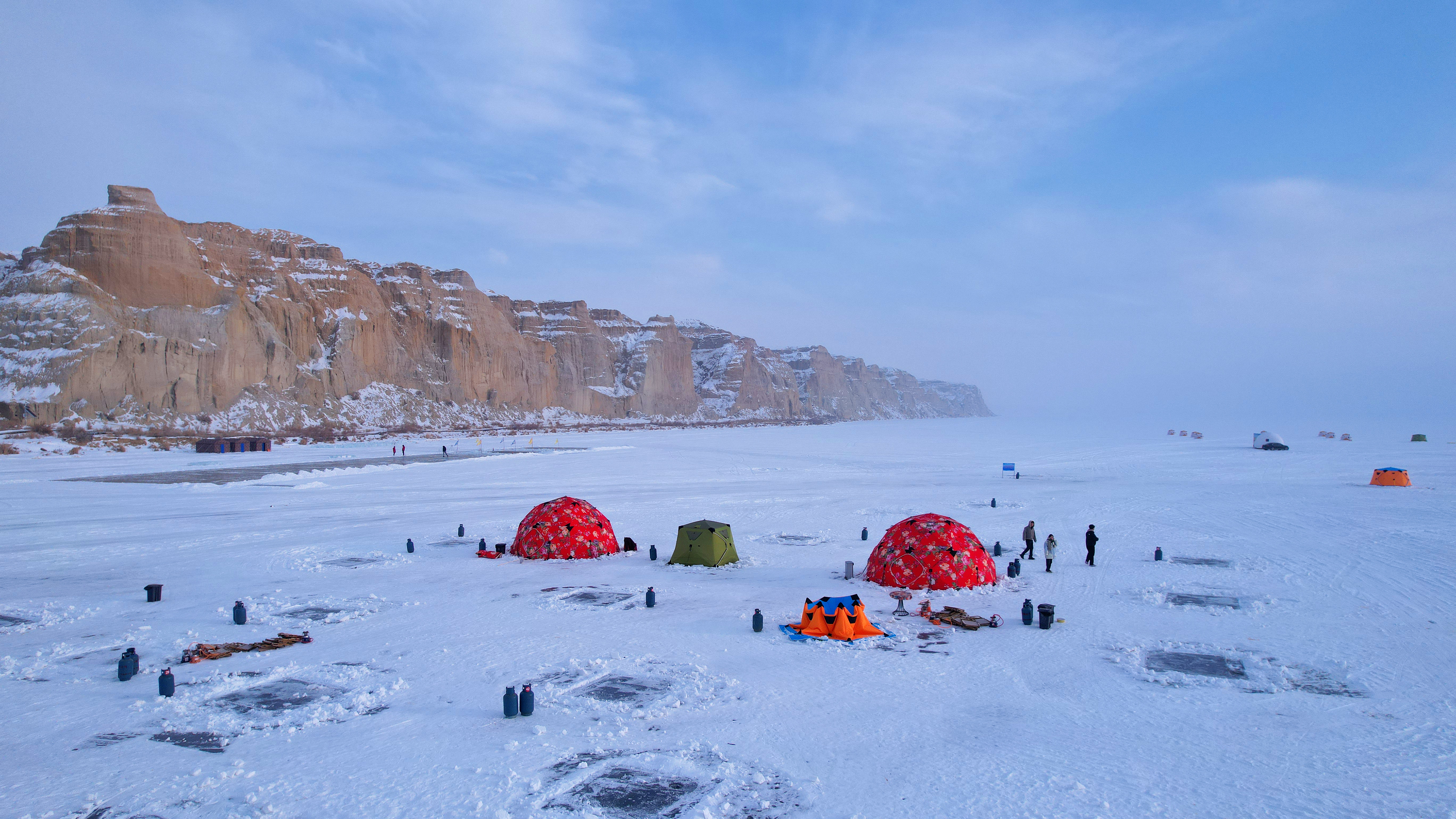 海上魔鬼城景区为冰钓游客搭建的帐篷。