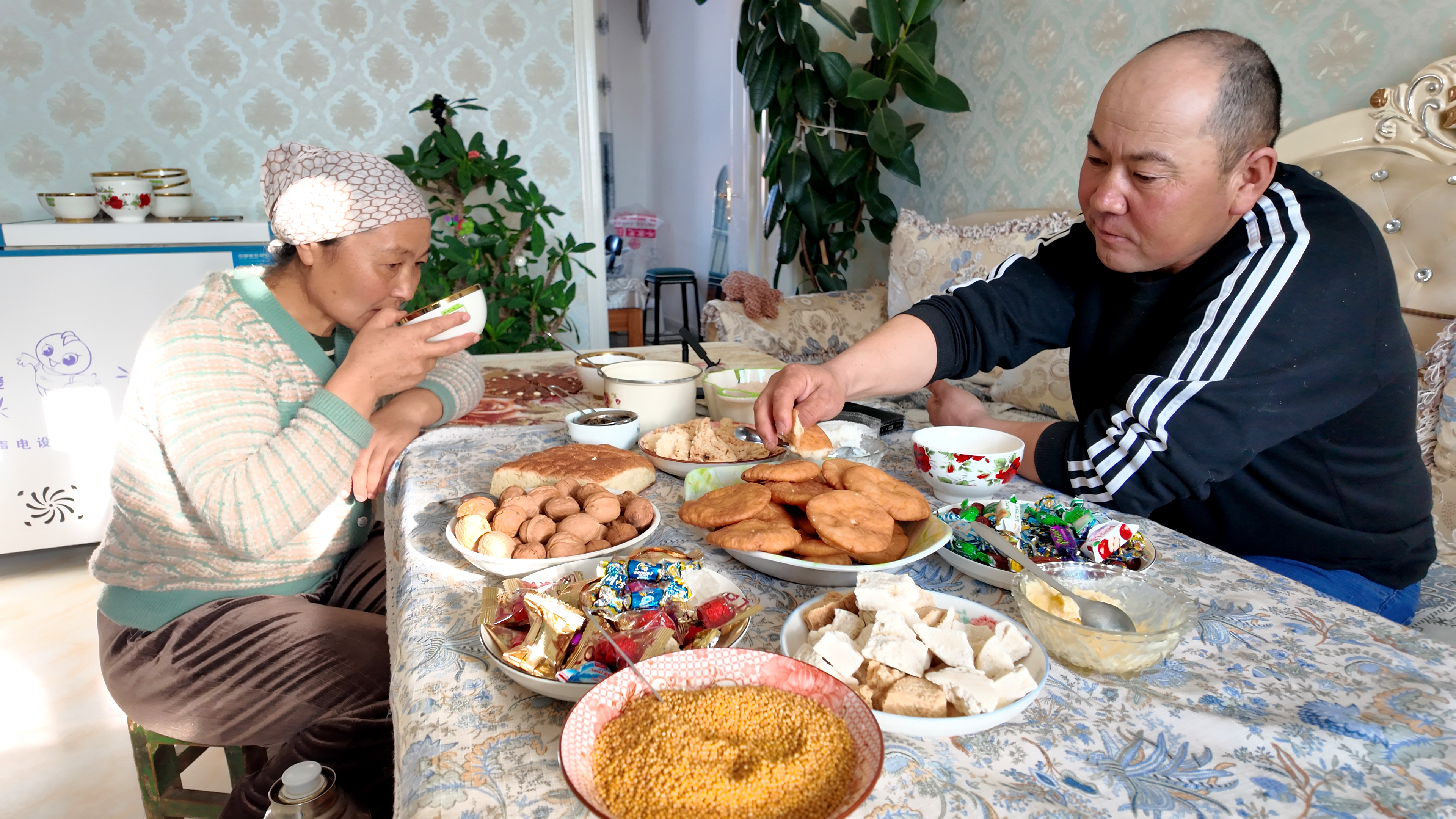 1月17日,富蕴县吐尔洪乡托留拜克孜勒村村民阿勒斯别克·谢尔亚孜正和妻子在家中喝茶。记者 张福新摄