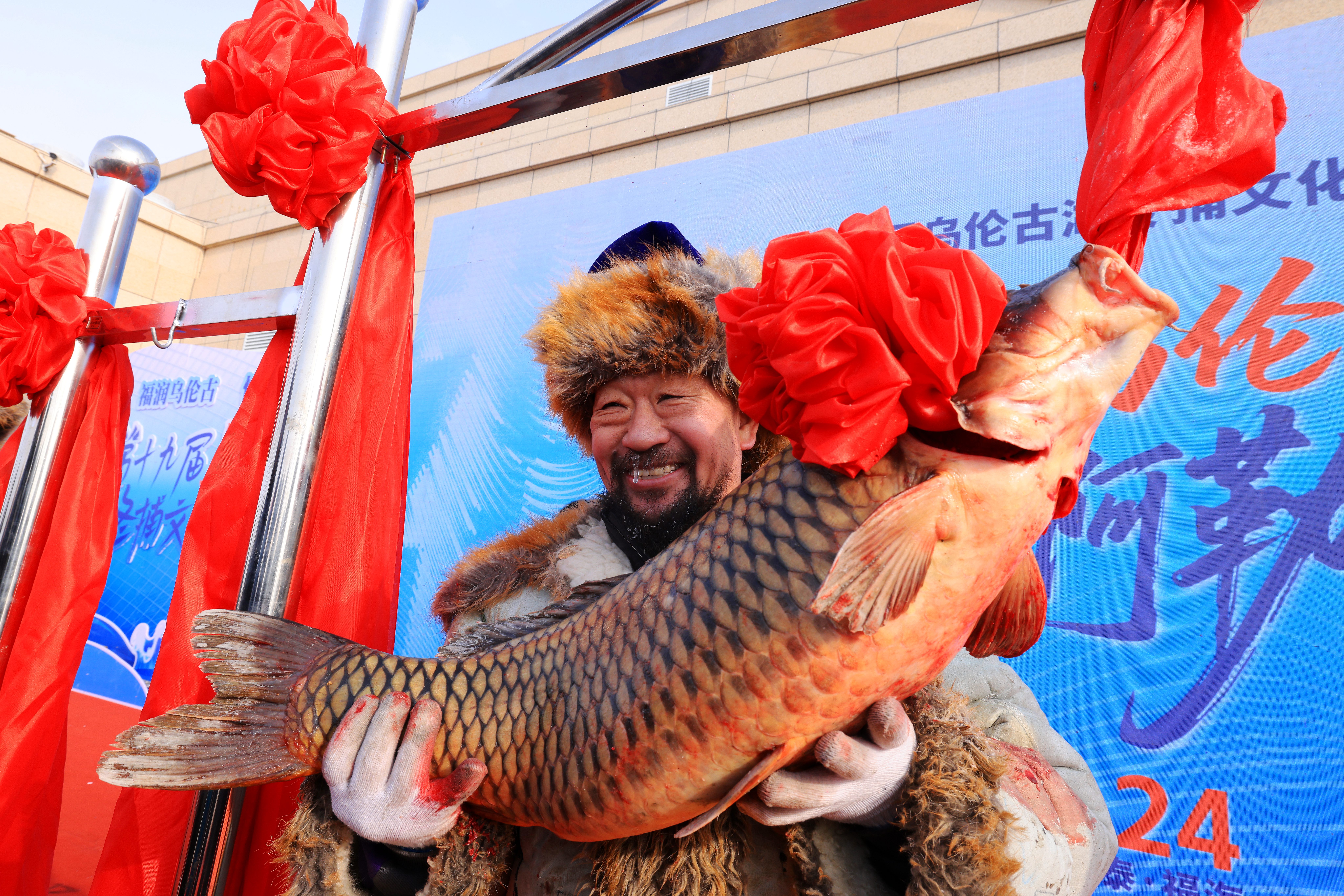 开幕式上,最受瞩目的环节莫过于“敬湖醒网”仪式。身着传统羊皮袄的渔工们在“鱼把头”张海江的带领下,手持酒碗,将美酒一半洒向冰面,祈愿湖泽馈赠、平安丰收,另一半一饮而尽,以庄严仪式表达世代渔民对自然的敬畏与感恩。随着绞网机隆隆启动,连接200多个冰洞的大拉网缓缓收拢,鲜活的狗鱼、鲢鱼、鲤鱼不断从冰洞中拉出,在冰面上翻滚跳跃,瞬间点燃全场气氛。游客们纷纷围拢,或拍照留念、或参与福鱼竞拍,冰面上的欢呼声、渔工号子与丰收的喜悦交织成隆冬最美的乐章。其中,一条重达18.8公斤的大鲤鱼被选为首条“福鱼”,现场赠予福海县敬老院,寓意吉祥安康、温暖共享。
