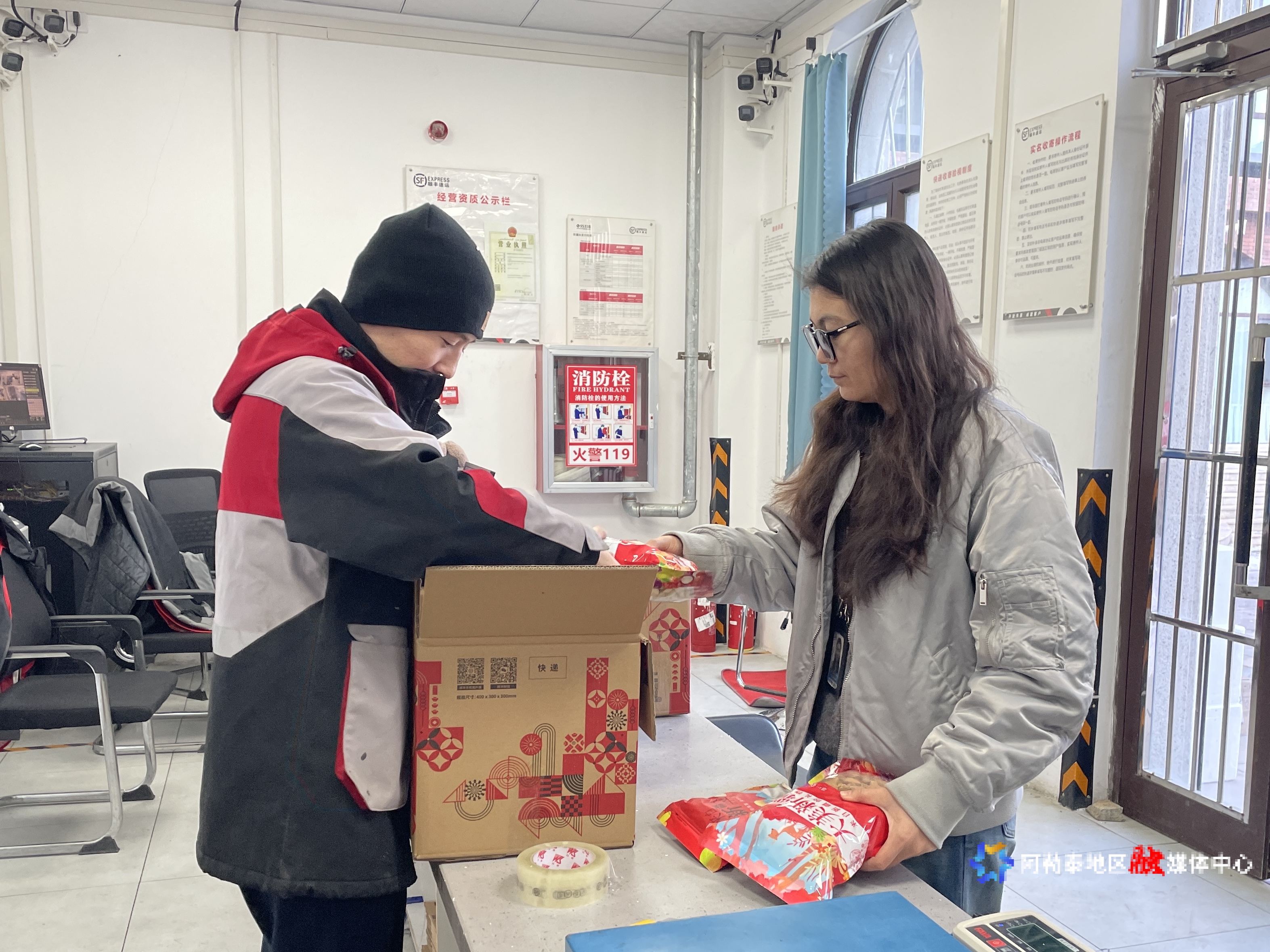 阿勒泰新闻网-阿勒泰地区融媒体中心(记者 古扎丽·阿布都热西提 实习记者 巴丽江·毛里别克)2月4日,地区各快递网点、邮政营业厅一派繁忙,打包、贴单、核验、分拣……各环节有序衔接,工作人员全员在岗应对业务高峰。市民们携带真空包装的特色肉制品、奶制品、坚果及冰雪主题文创产品前来寄件。