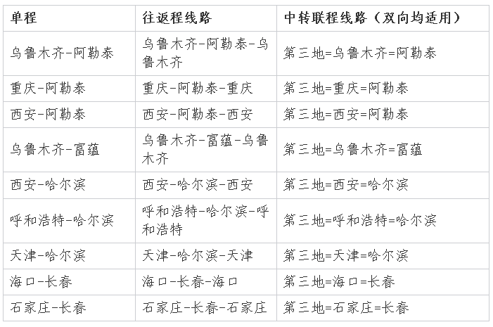 在航线覆盖方面,政策适用于目的地为上述四地的单程、往返、中转联程航班,涵盖天津—哈尔滨、乌鲁木齐—阿勒泰、重庆—阿勒泰、西安—阿勒泰、呼和浩特—哈尔滨、??凇ご骸⑹易ご旱榷嗵跞让畔呗?。中转联程则支持第三地经天津、乌鲁木齐、重庆、西安、???、石家庄等中转地往返四个冰雪目的地,活动期间新开的相关航线将同步适用。