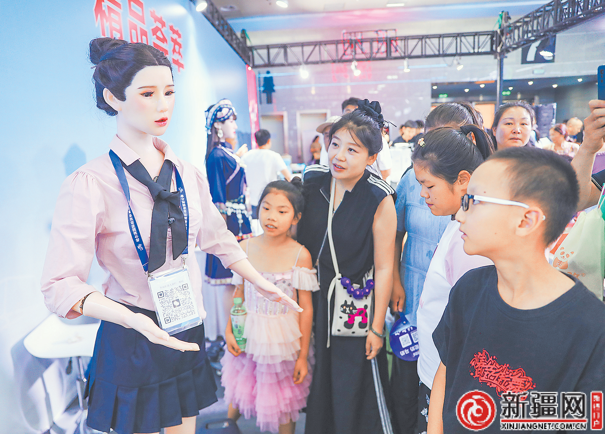 6月29日,在2025(中国)亚欧商品贸易博览会,数字技术、人工智能展厅深圳展位的、仿真服务机器人吸引观众驻足。(记者米热扎提·木塔力甫摄)